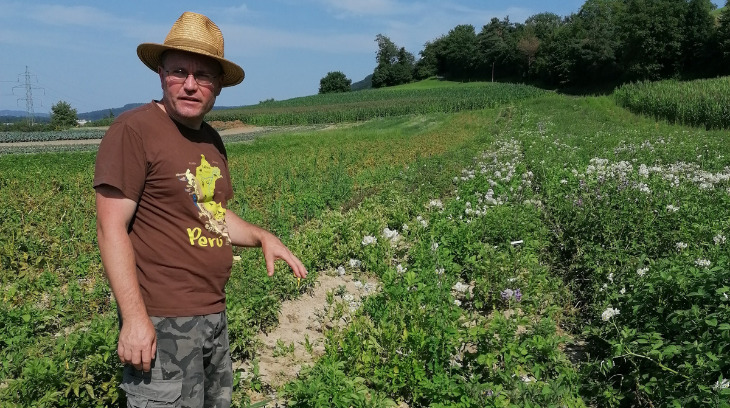 Rotes Nüdeli, Moon Lightning oder auch einfach 19.A0080.X – alles sind Kartoffelsorten, die auf dem Züchtungsbetrieb Varietas wachsen. Stefan Griesser ist der Mann, der hinter der Firma steckt. Anlässlich der offenen Türen Ende Juli gewährte er einen Blick hinter die Kulissen der Züchtungsarbeit. Langer Weg bis zum Feldtest Stefan Griesser entnimmt Pollen von einer Pflanze im Treibhaus. «Die Bestäubung von Hand…