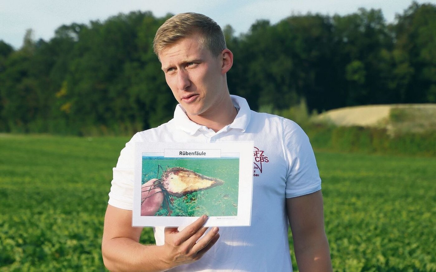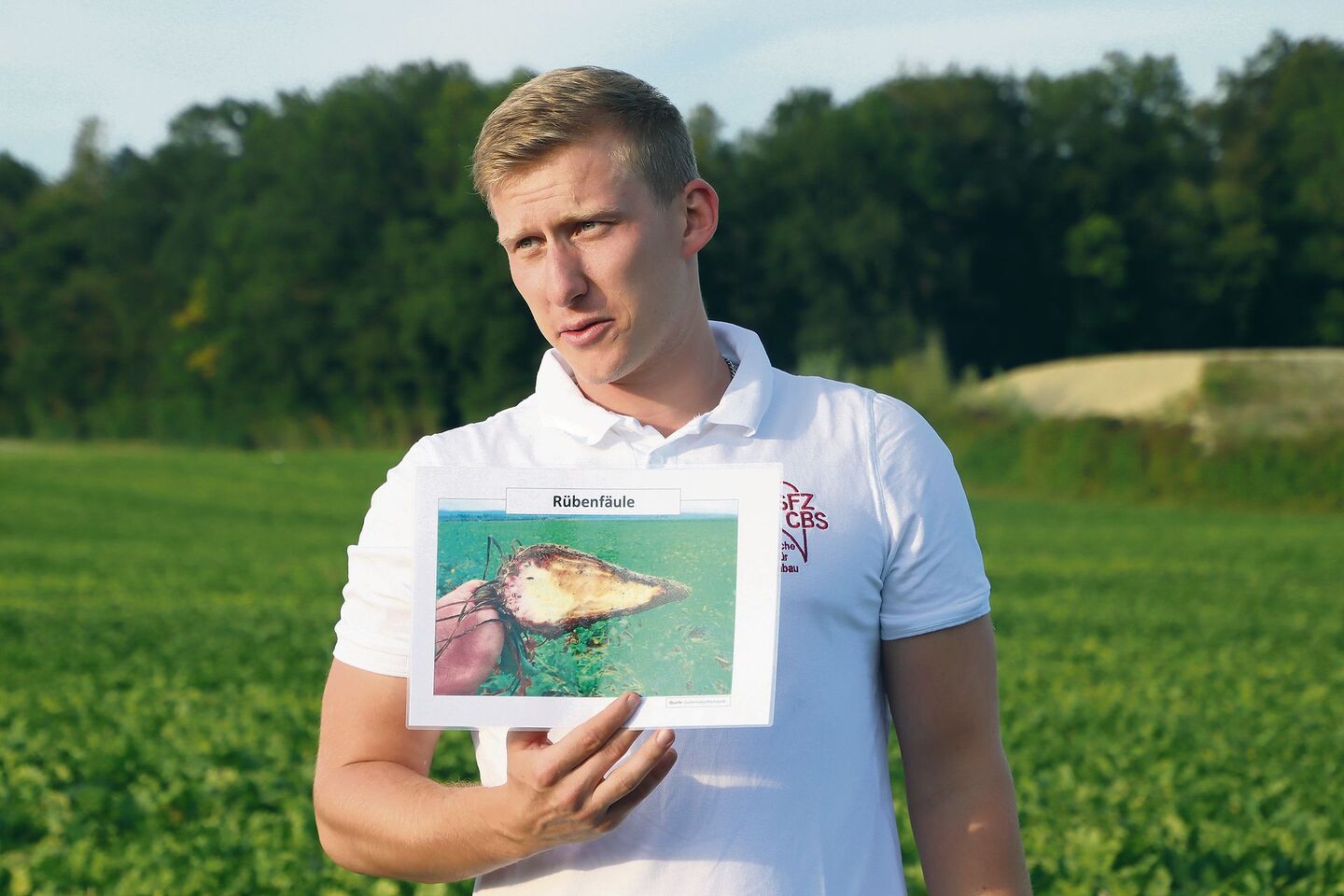 Im kommenden Herbst wird die Rübenfäule zum Teil eine Herausforderung. «Wir verzeichnen trotz langen Fruchtfolgen teilweise einen starken Befall. Dieser ist auf Sauerstoffmangel im Boden zurückzuführen», stellte Luzi Schneider fest. Wer einen Befall hat, soll dies entsprechend kommunizieren, damit diese Rüben zuerst abgeführt und verarbeitet werden können. Sind einzelne Abschnitte in einer Parzelle voll befallen, ist auf eine entsprechende Rodung gar zu verzichten. Auf dem Versuchsfeld hat auch der Pflanzenschutzanbieter Stähler einen grösseren Versuch angelegt. «Wir haben bisher drei Spritzungen gegen Blattflecken durchgeführt», sagte Thomas Steiner, welcher die Versuche betreut. Die Wirkung lässt sich zeigen, da kaum Blattflecken auszumachen sind. Er zeigte sich mit Blick auf die Rübenvergilbung etwas besorgt. Denn diese ist bereits westlich von Solothurn angekommen.