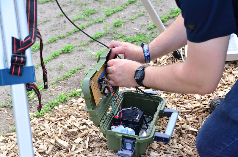 Nur etwa drei Monate Zeit hatte Wermers für den Bau des ersten Prototyps. „Das hat aber gereicht, um zu zeigen, dass meine Idee grundsätzlich funktioniert.“ Sein Masterstudium hat er erfolgreich beendet und einige Erkenntnisse gewonnen, die jetzt in die zweite Generation einfließen – denn der 25-Jährige bleibt dem Projekt als wissenschaftlicher Mitarbeiter erhalten. „Der Prototyp ist batteriebetrieben, und ich musste die regelmäßig austauschen. Das neue Messgerät bekommt ein Solarpanel, damit das schon mal wegfällt.“ Außerdem baut er in der zweiten Generation gleich zwei Modelle – eins für das Feld in den Niederlanden und eins für das auf dem Steinfurter Campus der Hochschule. „Wir haben hier einen ganz kleinen Acker zu Versuchszwecken, und hier habe ich Petersilie gesät. Ich werde also auch in Steinfurt messen und die Daten mit denen aus den Niederlanden vergleichen.“ Verläuft all das erfolgreich, könnte die Messstation in Serie gehen – und somit die Kosten für die Überwachung der Pflanzen minimieren.
