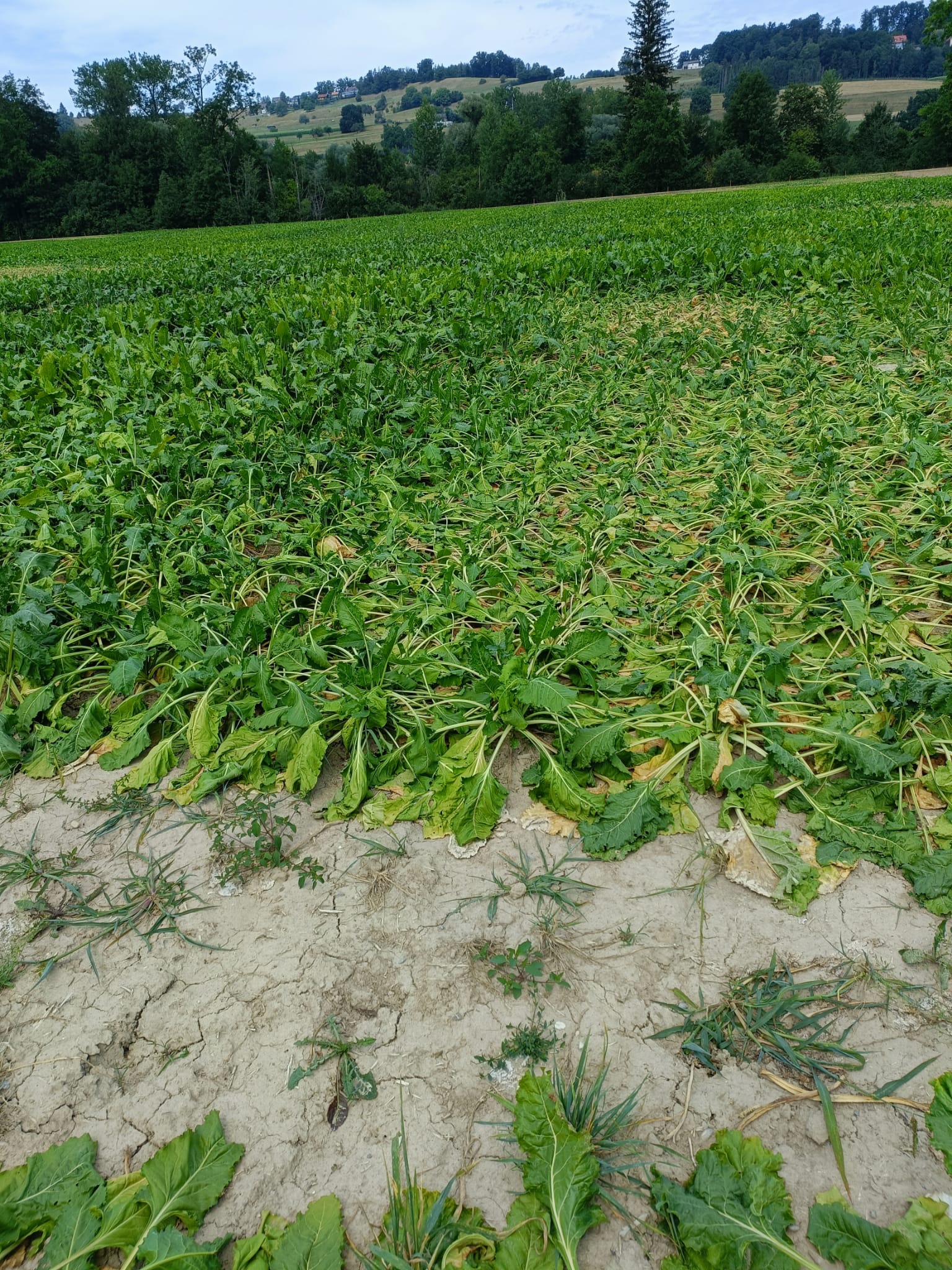 Dank feuchten und warmen Bedingungen legten die Rübenkörper im Juni deutlich an Gewicht zu. Diese erfreuliche Entwicklung wurde in den letzten drei Wochen durch Hitze und Trockenheit gebremst. Ein Blick auf die Niederschlagsmengen seit Anfang April zeigt vor allem im Westen ein deutliches Wasserdefizit. Trotz der derzeit fehlenden Feuchtigkeit welken die Rüben nur vereinzelt. Im bereits trockenen Mai bildeten sie ein ausgeprägtes Wurzelwerk, welches sich jetzt als Vorteil erweist.