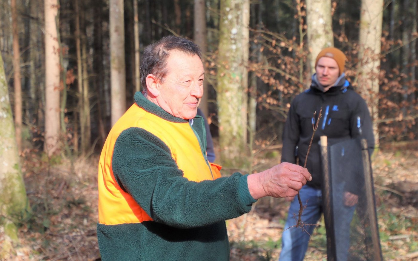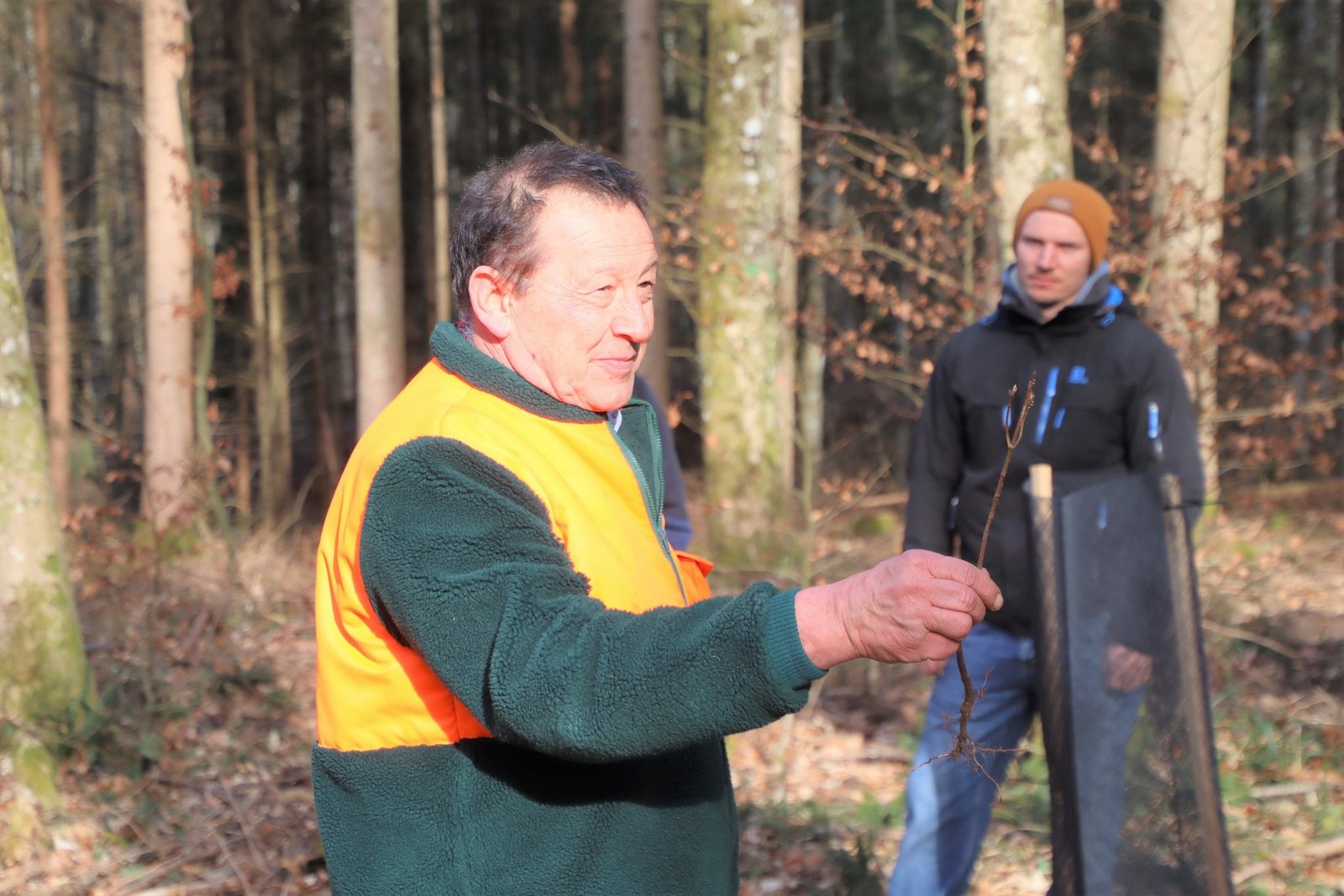 Dann folgten viele fachliche Informationen über die Wiederaufforstung von offenen Käferholzflächen, wie sie bei der ehemaligen Pflanzschule umgesetzt wurde. Auf der entsprechenden Fläche sind gezielt die sehr seltenen, aber bei uns heimischen Elsbeerbäume gepflanzt worden. Einzelschütze sorgen dafür, dass die Rehe diese Jungbäume nicht verbeissen können. Zugleich strebt Langenegger auf dieser Parzelle eine Naturverjüngung an.
