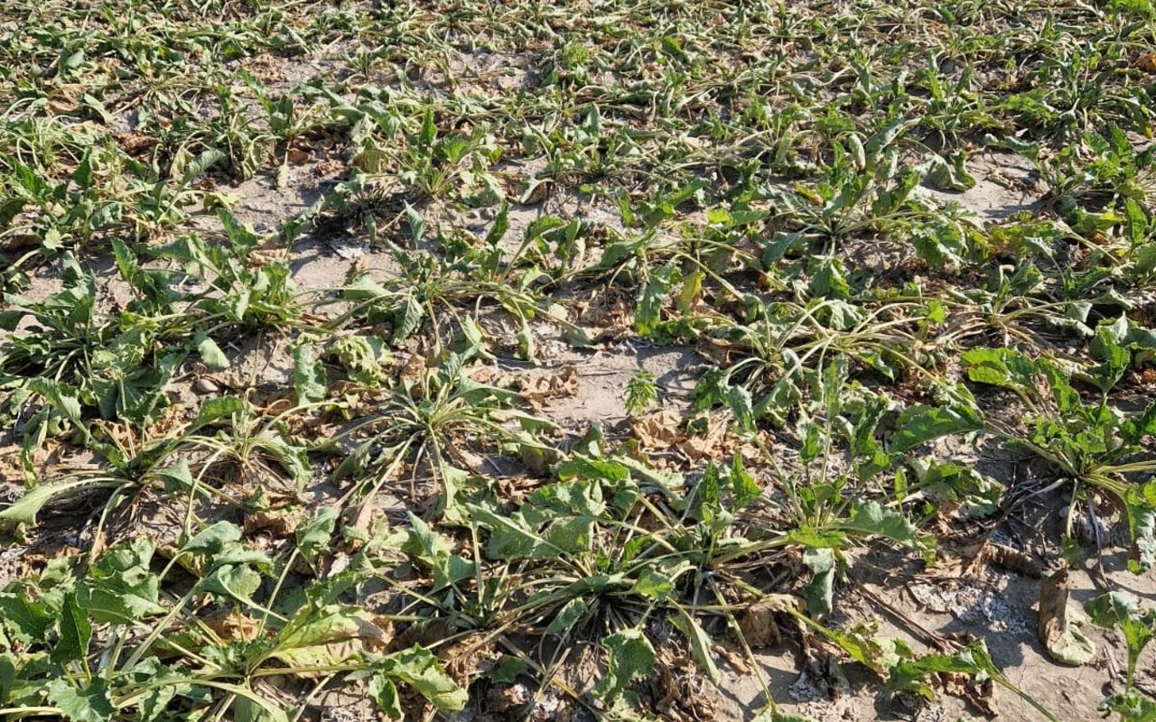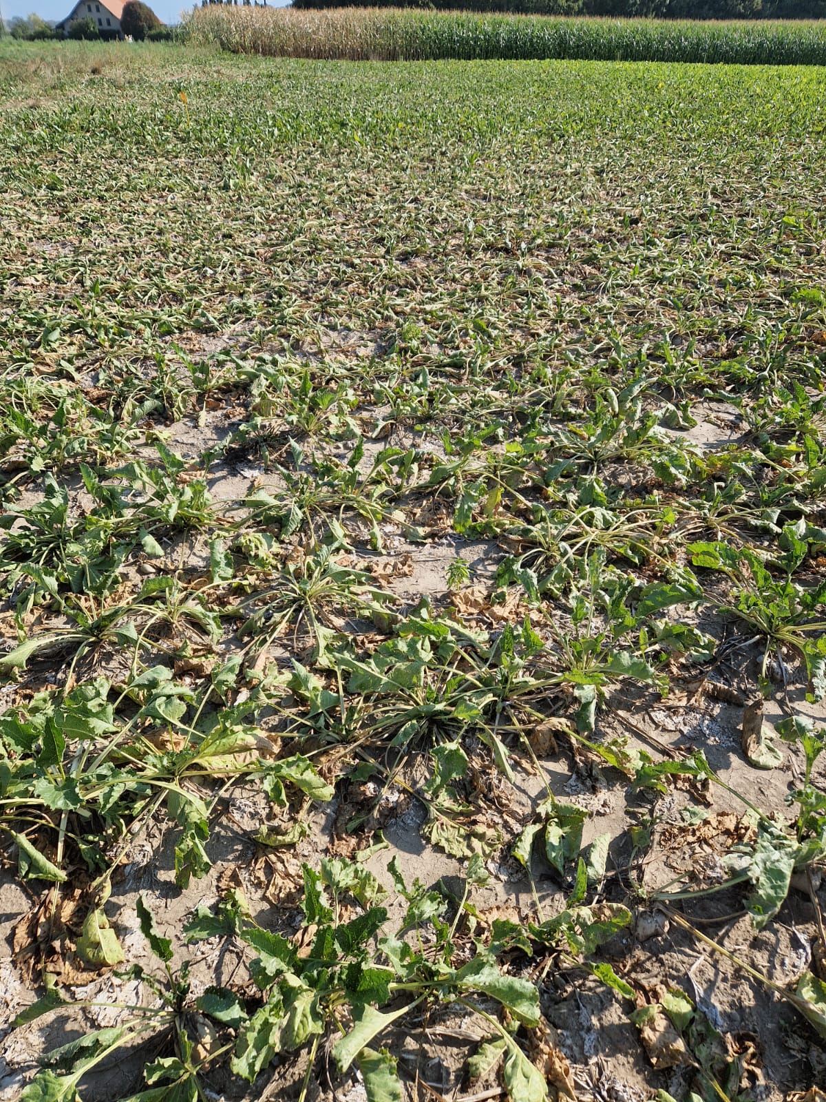 Die Zuckerrüben präsentieren sich sehr unterschiedlich. Vorwiegend im Osten, wo genug Regen gefallen ist, sehen die Zuckerrüben schön aus. In Regionen wie im Mittelland oder im Westen, wo seit Wochen auf Niederschläge gewartet wird, stehen die Zuckerrüben vielerorts nicht mehr auf. Auf Betrieben mit Parzellen auf Kiesadern sind die Bilder teilweise brutal. Die Blätter sind komplett vertrocknet und werden sich wohl kaum noch erholen resp. wieder aufrichten. Auf diesen Parzellen muss wohl mit einem Neuaustrieb des Laubes gerechnet werden. Ein kompletter Neuaustrieb kostet gut und gerne 1 bis 2 Prozent Zuckergehalt.