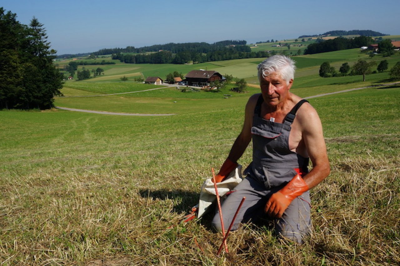 Ein Schatten huscht über das frisch gemähte Feld. Christian Zwahlen schaut auf. Hoch oben, am wolkenlosen Himmel, kreist ein Milan. "Der kennt mich und wartet schon auf die Mäuse", sagt Zwahlen und schmunzelt. Der stille Beobachter wird sich noch etwas gedulden müssen. Zwahlen hat die Mäusefallen gerade erst gerichtet. Die Chancen stehen aber gut, dass es später für den Raubvogel etwas zu fressen gibt, denn: "In fast…