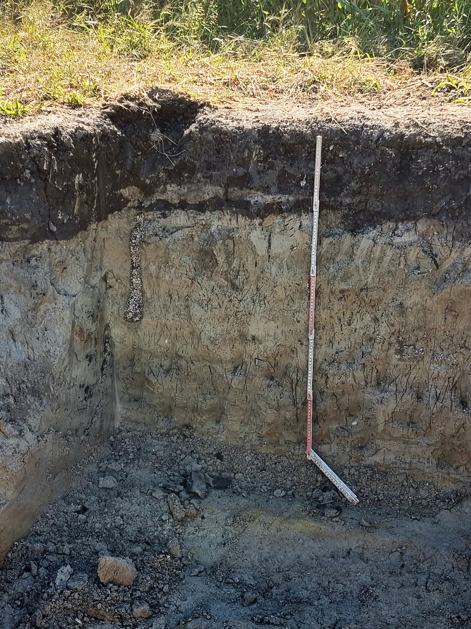 Die punktuellen Verwässerungen seien das grosse Problem, bestätigt Matthias Stettler, der als Bodenexperte das Projekt begleitet. Er steigt in ein Loch, um anhand des Bodenprofils die Lage darzustellen. Nur die obersten rund 25 cm sind an dieser Stelle noch fruchtbar. Der Rest ist verschwunden. «Dieser Boden ist so gut, der geht direkt in den Himmel», pflege er jeweils zu sagen, sagt Stettler. Unter dem verbleibenden fruchtbaren Boden stellt er eine verdichtete Schicht fest, die das Wasser kaum durchlässt.