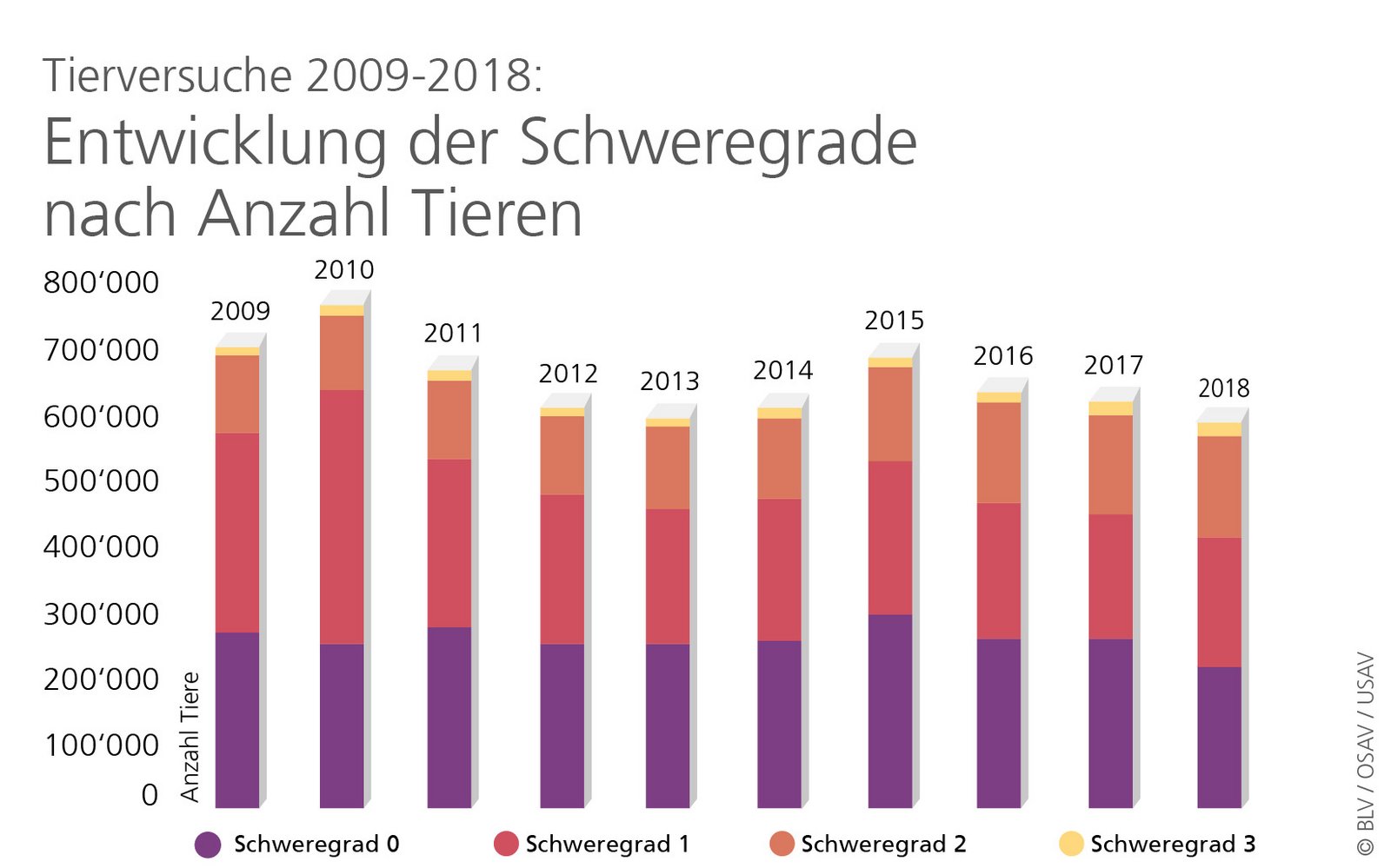 In den letzen zehn Jahren wurden weniger Tiere bei Schweregrad 1 eingesetzt (minus 34 Prozent), aber bei Schweregard 2 nahm die Zahl um 26,4 Prozent gegenüber 2009 zu. Bei Schweregrad 3 gibt es keine klaren Tendenzen, die Zahlen schwanken von Jahr zu Jahr.
