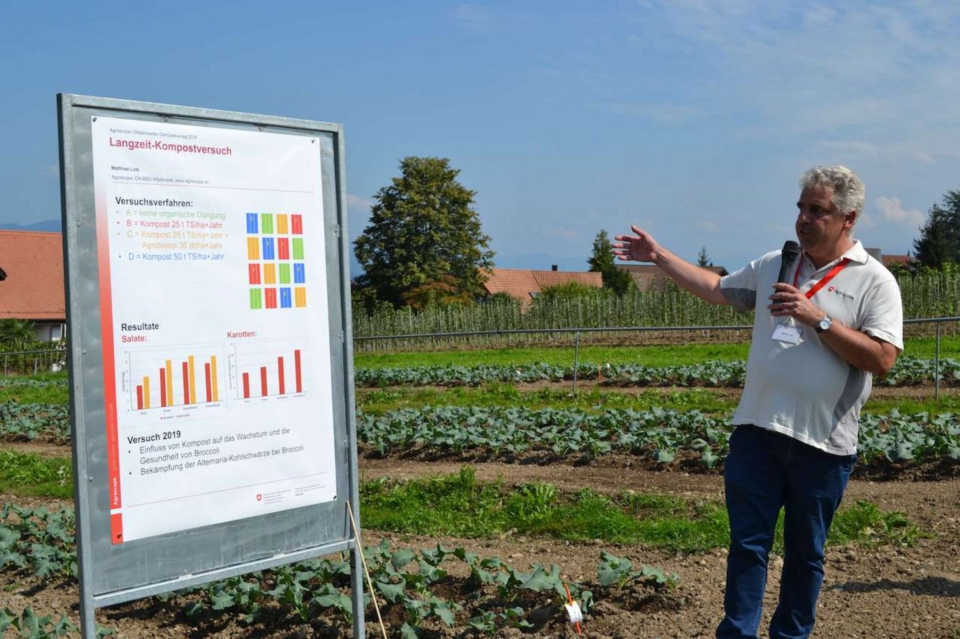 In Langzeit-Versuchen untersucht Matthias Lutz die Wirkung von Kompost. Jedes Jahr wurden andere Kulturen angepflanzt, 2018 war es Salat. In der Zeit von 2011 bis heute konnte die Menge organischer Substanz durch die Düngung mit Kompost verdoppelt werden, erklärte Lutz. Beim Salat stieg das Erntegewicht mit der Menge Kompost, eine schwarze Mulchfolie wirkte sich ebenfalls trotz sommerlicher Hitze positiv aus.