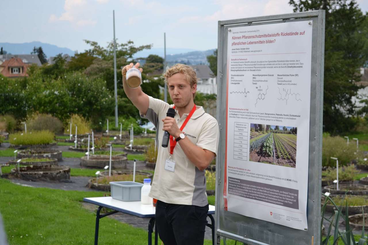 Die Rückstandsbildung und das Abbauverhalten von Beistoffen in Pflanzenschutzmitteln seien bisher kaum erforscht worden, so Daniel Janser. Janser untersucht daher, ob diese Substanzen auf dem Erntegut in Rückständen nachzuweisen sind. Ob diese eventuell toxisch wären, konnte der junge Forscher nicht sagen. Derartige Beistoffe seien aber auch in diversen anderen Produkten enthalten, etwa in Medikamenten oder in Industriewaren.