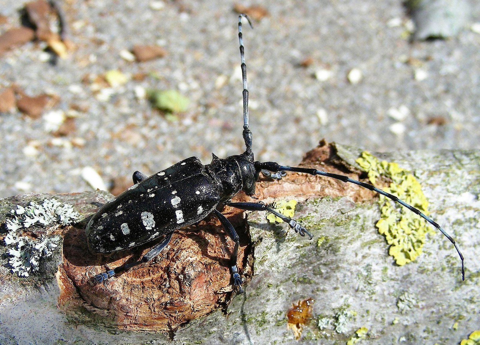 Der ALB ist ein 2,5 bis 3,5 Zentimeter grosser Käfer, glänzend schwarz und trägt rund 20 unregelmässige helle Flecken auf den Flügeldecken. Auffällig sind die langen Fühler (beim Weibchen gut so lange wie der Körper, bei Männchen mindestens die doppelte Körperlänge). Die beinlose Larve misst rund fünf Zentimeter und trägt auf dem Nackenschild ein zinnenförmiges Band.