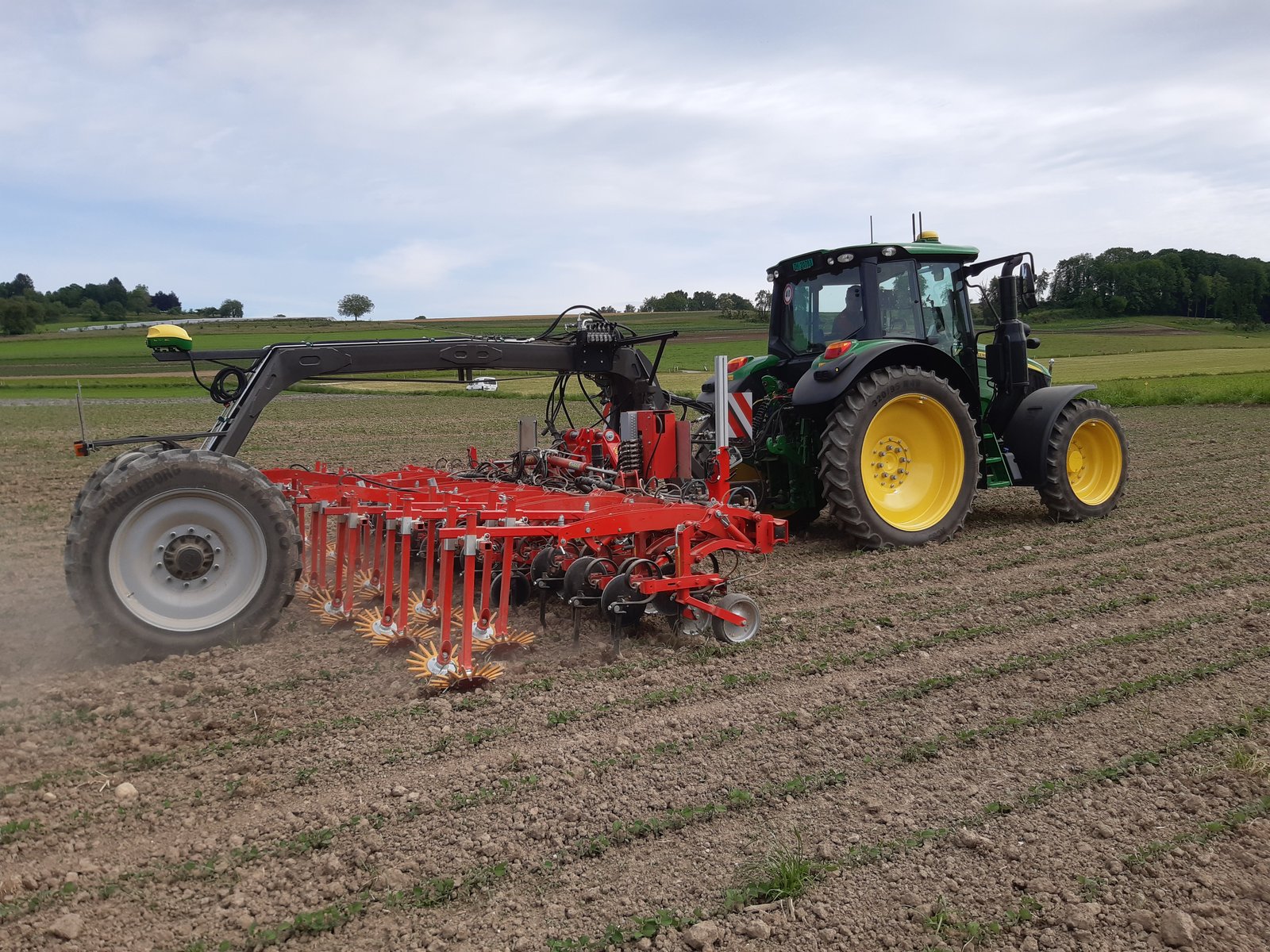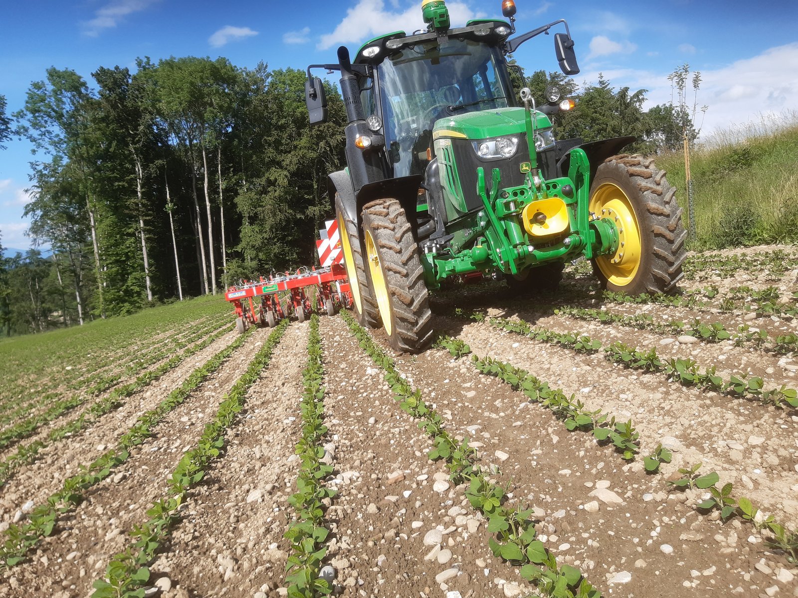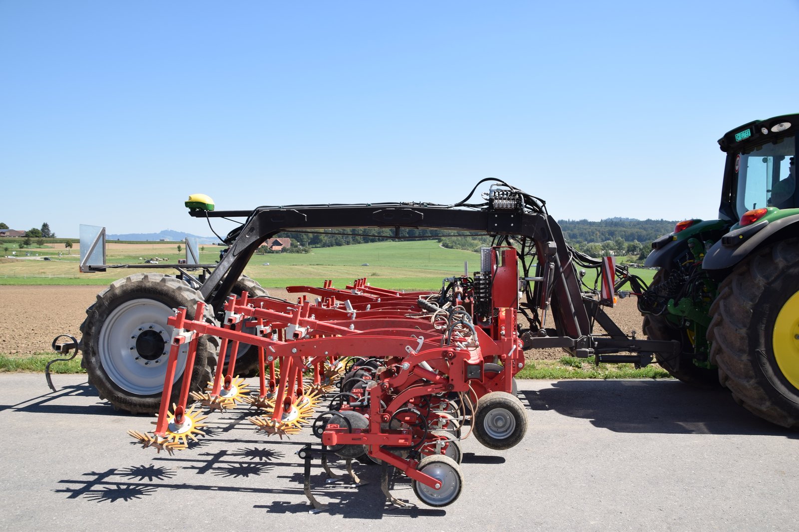 [IMG 13] Wie ein Koloss steht ein glänzender John Deere 6120M auf dem Vorplatz des Lohnunternehmens Schneeberger und Berger in Oberbottigen BE. Danebenstehend trifft man auf Ruedi Emch, der Tüftler hinter dem angehängten Trägerwerk. Schwarzes Maschinenfett verziert die von harter Arbeit gezeichneten Hände des Landwirts, der zu einem häufigen Problem eine Lösung gefunden hat. Präzises Hacken in Hanglagen Das Hacken…