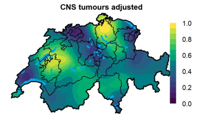 Die Karte zeigt die räumliche Verteilung von Hirntumoren bei Kindern, korrigiert für Luftkonzentrationen von Stickstoffen, Gamma- und kosmische Strahlung, regionalen Wohlstand, Länge der Datenreihe, Sprachregion und Urbanisierungsgrad. Es zeigt sich eine deutliche Häufung im Seeland und dem Zürcher Weinland. (Grafik Konstantinoudis, G., Schuhmacher, D., Ammann, R.A. et al.)