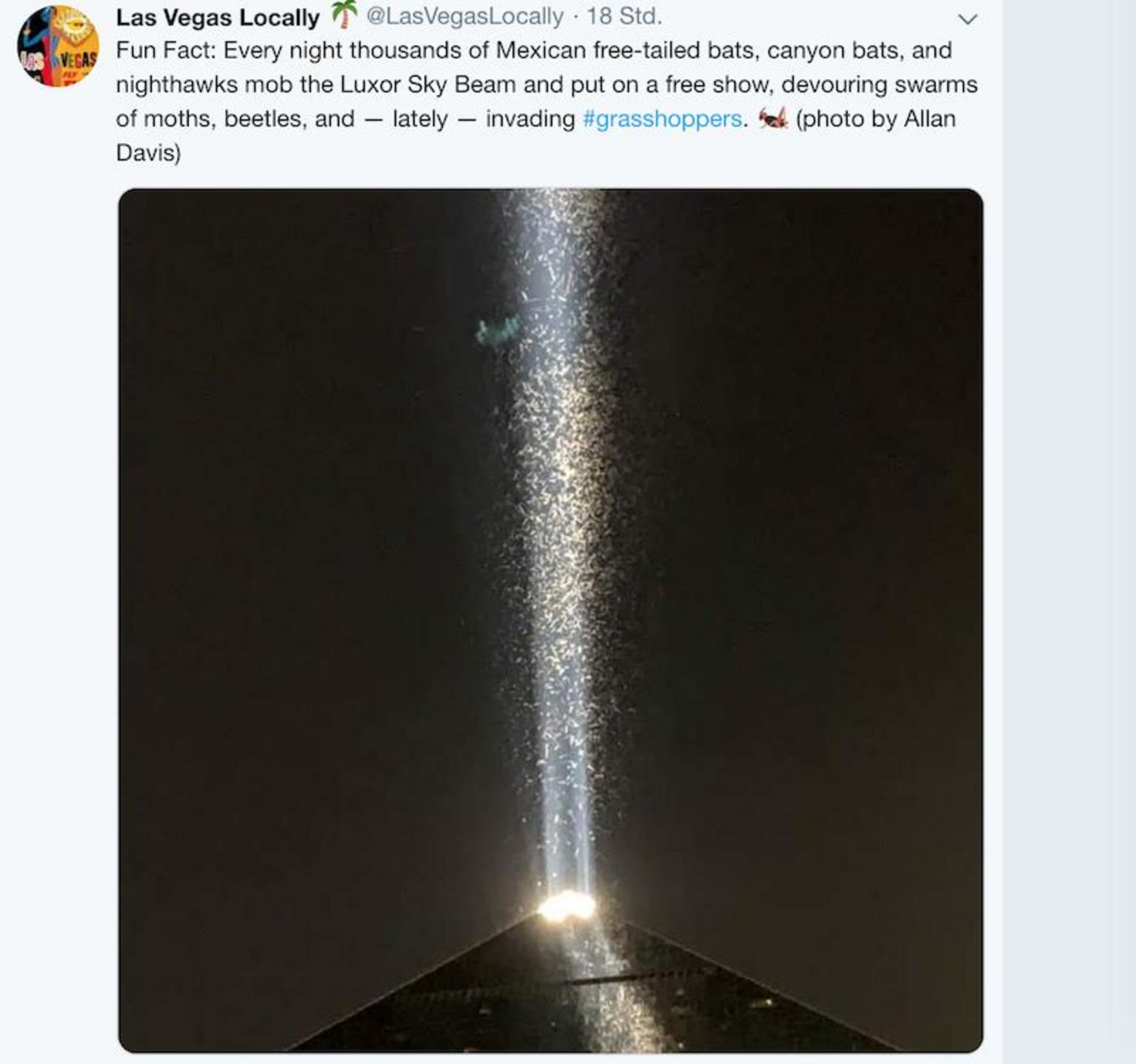 Verblüffte Besucher und Bewohner der Kasinostadt im US-Bundesstaat Nevada haben schon unzählige Fotos in Online-Netzwerken veröffentlicht, die Insektenschwärme vor bunten Neonlichtern und auf dem Bürgersteig der Kasinomeile Las Vegas Strip zeigen.