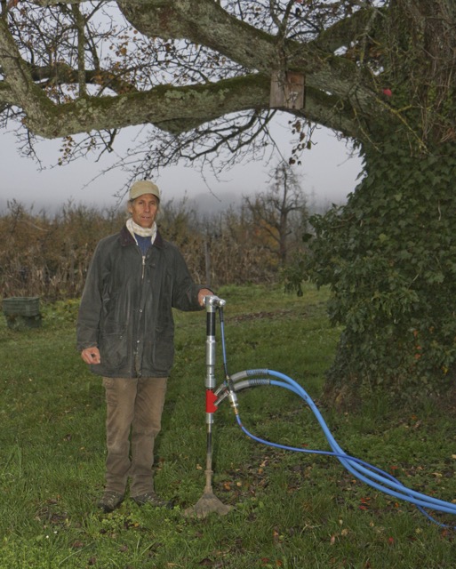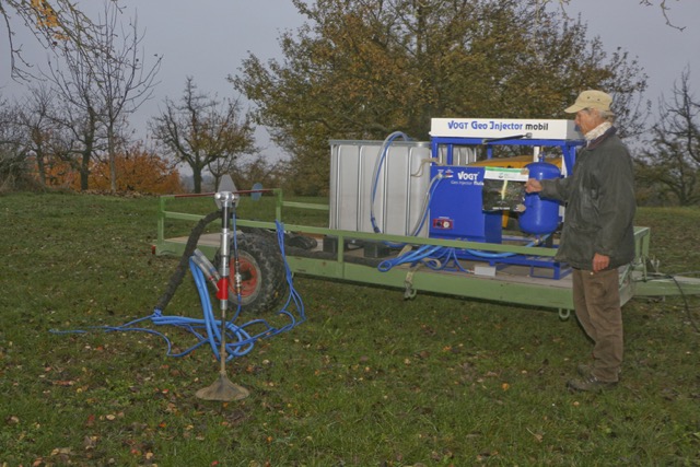 Die Bodenlockerung mit Druckluft sowie das Einbringen der Mikroorganismen erfolgte beim Versuchsstart im Frühling 2018 mit einer Lanze bis in eine Tiefe von 40 cm in den Boden - rund um das Wurzelgeflecht geschwächter Hochstammbäume.