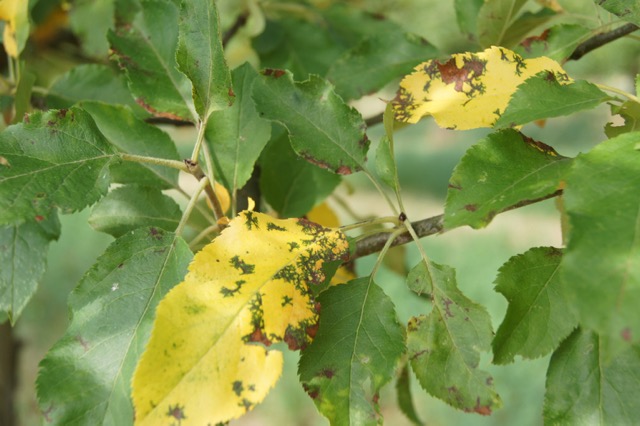 Zusätzlich treibt ein weiterer Erreger sein Unwesen: Einige Apfelsorten sind von der Marssonina-Blattfallkrankheit befallen, die von einem Pilz (Diplocarpon mali) ausgelöst wird. Zuerst gibt es grauschwarze diffuse Flecken auf den Blattoberflächen. Die Blätter werden danach gelb und fallen oft ab bevor die Früchte ausgereift sind. Wegen der reduzierten Blattmasse werden der Baum und die Früchte nicht mehr mit Nährstoffen versorgt. Auch durch Marssonina kann wiederholter Befall zum Absterben des Baumes führen.