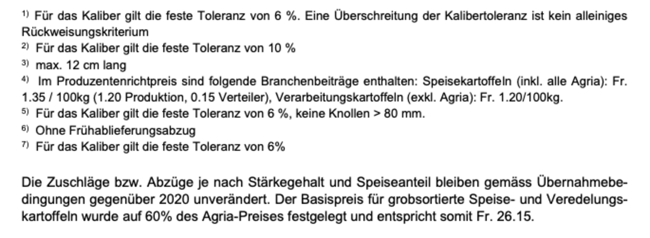 - In den aufgeführten Produzentenrichtpreisen für die Früh- und Speisekartoffeln (inkl. Agria) sind nebst den Branchenbeiträgen der Produktion (Fr. 1.20/100 kg) auch jene der Verteiler (Fr. 0.15/100 kg) enthalten. Dies gilt nicht für die Industriesorten, mit Ausnahme der Sorte Agria.