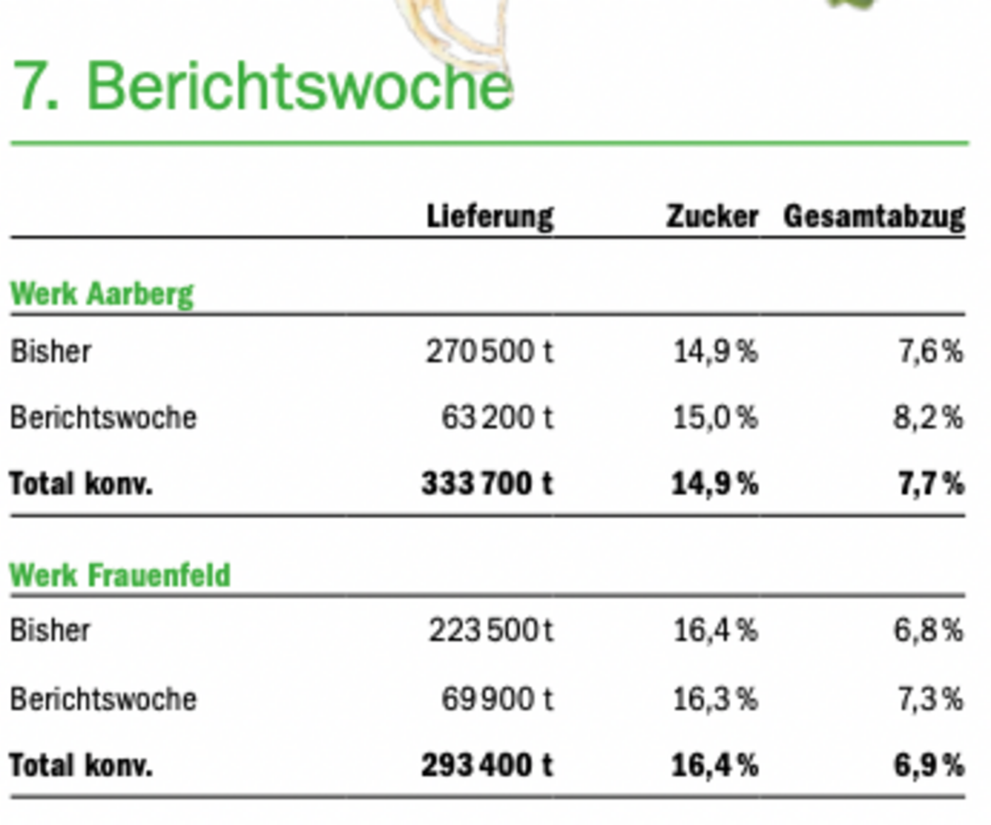 Während der Berichtswoche verarbeiteten beide Fabriken die geplanten Mengen bei konstanter Leistung. Entsprechend gab es auch bei den Rübenlieferungen nur geringe Anpassungen. In Aarberg wurden für den geplanten Betriebsunterbruch in der laufenden Woche v. a. die Lieferungen der Bahn angepasst, da die Ertragserwartungen tiefer sind als aus Regionen mit Strassenanfuhr. Zuckergehalte erholen sich In Aarberg haben…