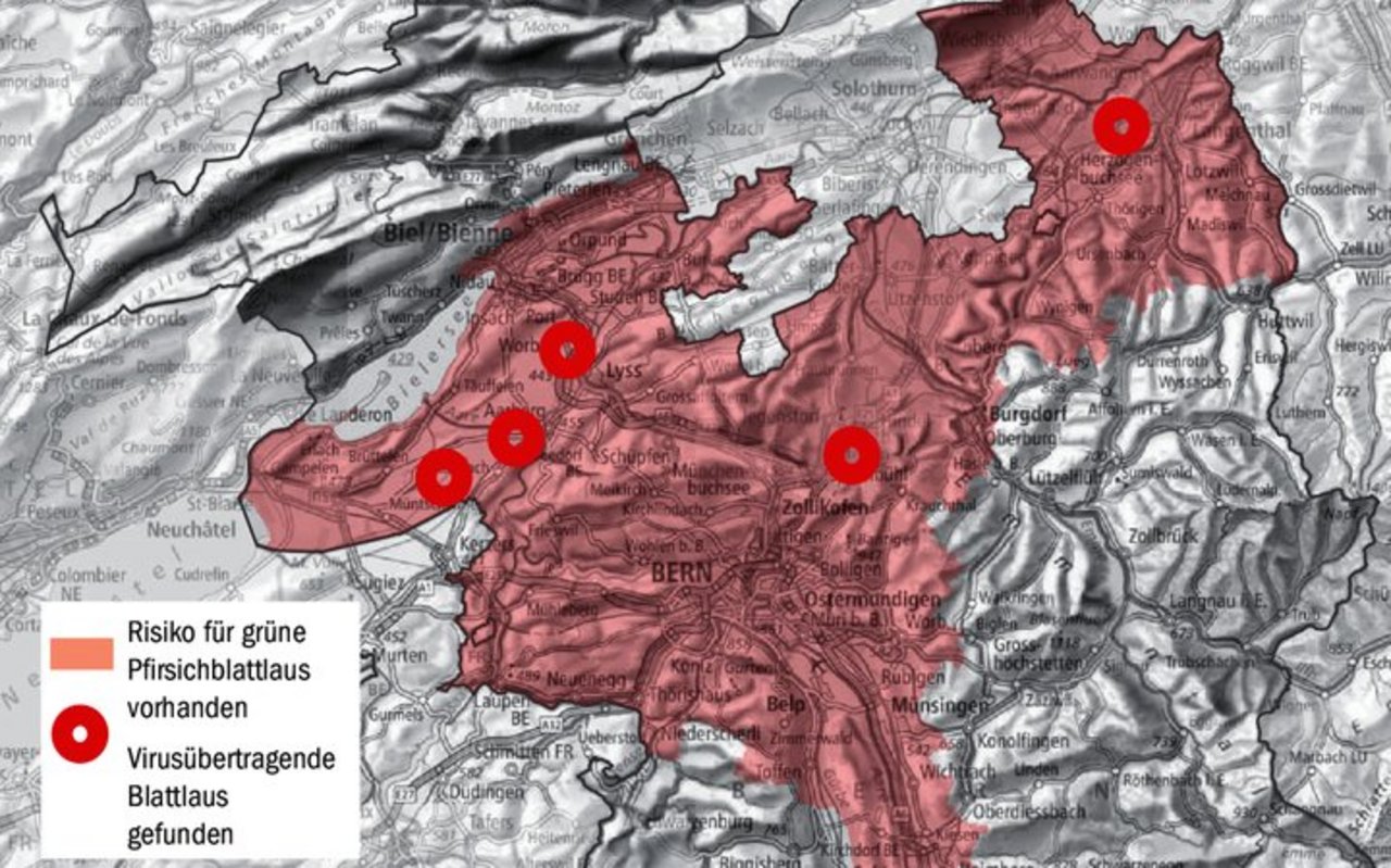 Anfang Woche wurden im Kanton Bern Grüne Pfirsichblattläuse gefunden. Sie sind die Hauptüberträger des Rübenvergilbungsvirus bei Zuckerrüben. In der Gemeinde Urtenen-Schönbühl wurden zwei Blattläuse gefunden, was aufgerundet der Bekämpfungsschwelle entspricht. In der Gemeinde Thunstetten wurde eine gefunden. Dies schreibt die Fachstelle Pflanzenschutz des Kantons Bern. Blattlausdruck und Bodenbefahrkarbeit prüfen «…