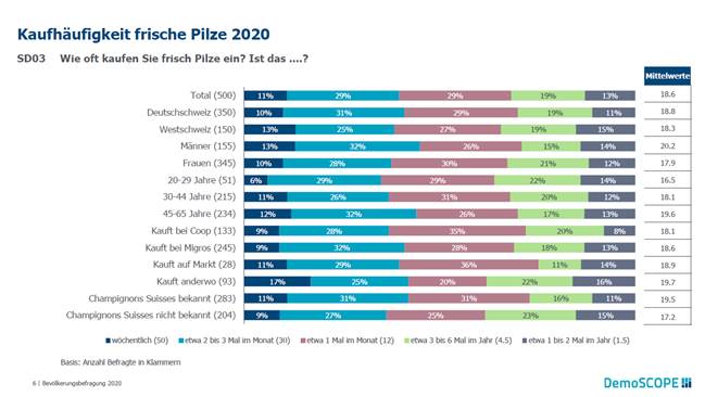 Die vom Verband Schweizer Pilzproduzenten VSP durchgeführte Bevölkerungsbefragung von Demoscope zeigt, dass die Kaufhäufigkeit bei frischen Schweizer Kulturpilzen vom Jahr 1999 - 2020 stetig zugenommen hat, schreibt der VSP in einer Medienmitteilung. 11 % der Befragten kaufen wöchentlich frische Pilze, dies mehrheitlich im Schweizer Detailhandel wie Coop oder Migros. 29 % der Befragten, die Mehrheit davon Männer, geben an, 2-3 mal pro Monat frische Schweizer Pilze zu kaufen.