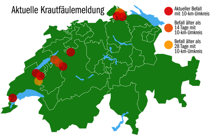 Die anhaltend feuchte Witterung der vergangenen Tage hat die Ausbreitung der Krautfäule begünstigt. Seit dem ersten in diesem Jahr gemeldeten Fall vor rund einem Monat wurden laut Phytopre, dem gemeinsamen Meldeprogramm der kantonalen Pflanzenschutzdienste und Agroscope, weitere Fälle registriert. So wurden in den vergangenen 14 Tagen neun neue Befälle gemeldet. Die aktuellen klimatischen Bedingungen schaffen ideale…