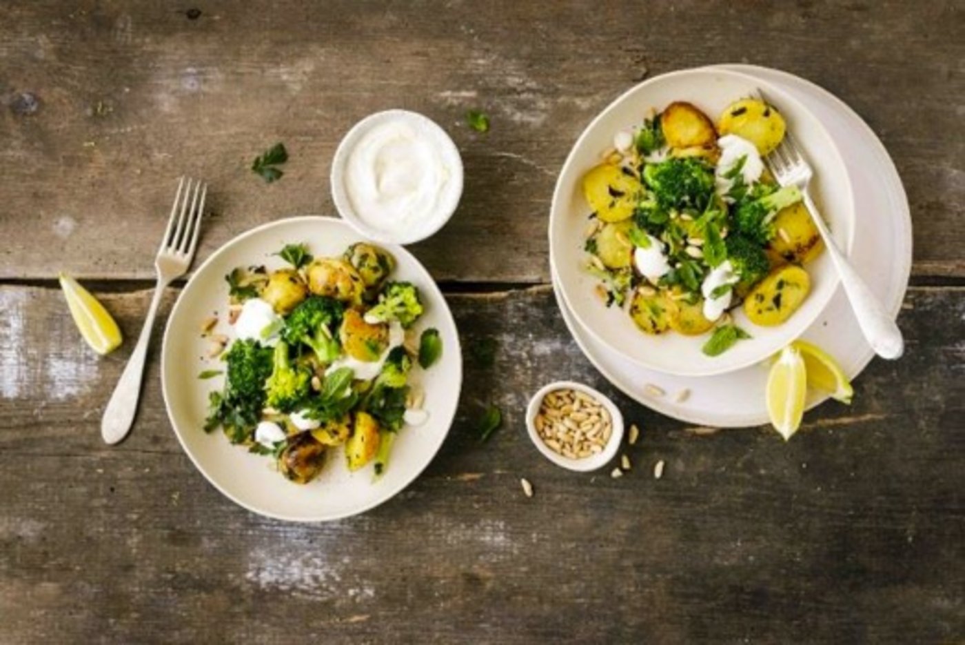 (Bratkartoffeln mit Broccoli, Minze, Pinienkernen und Joghurtsauce)