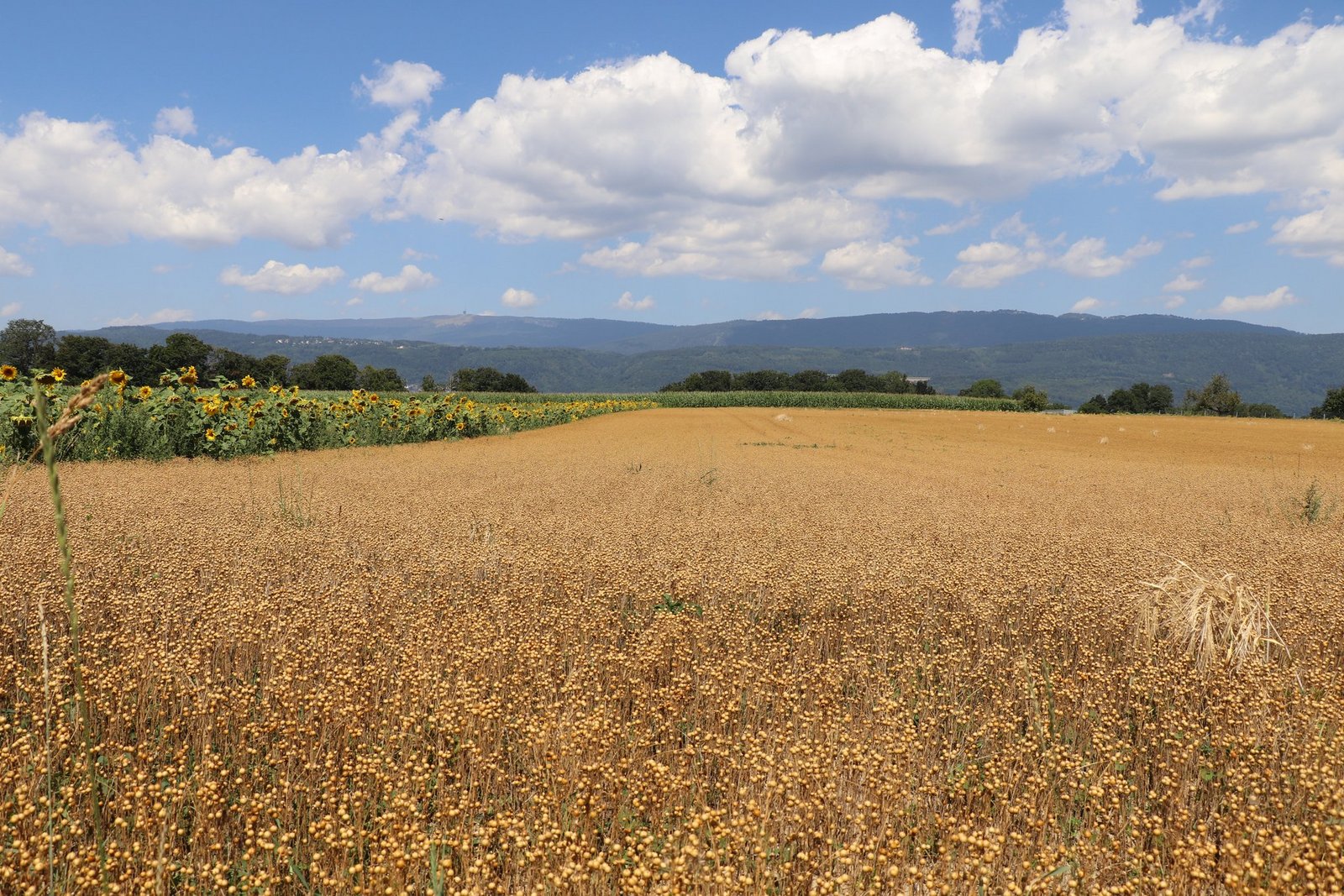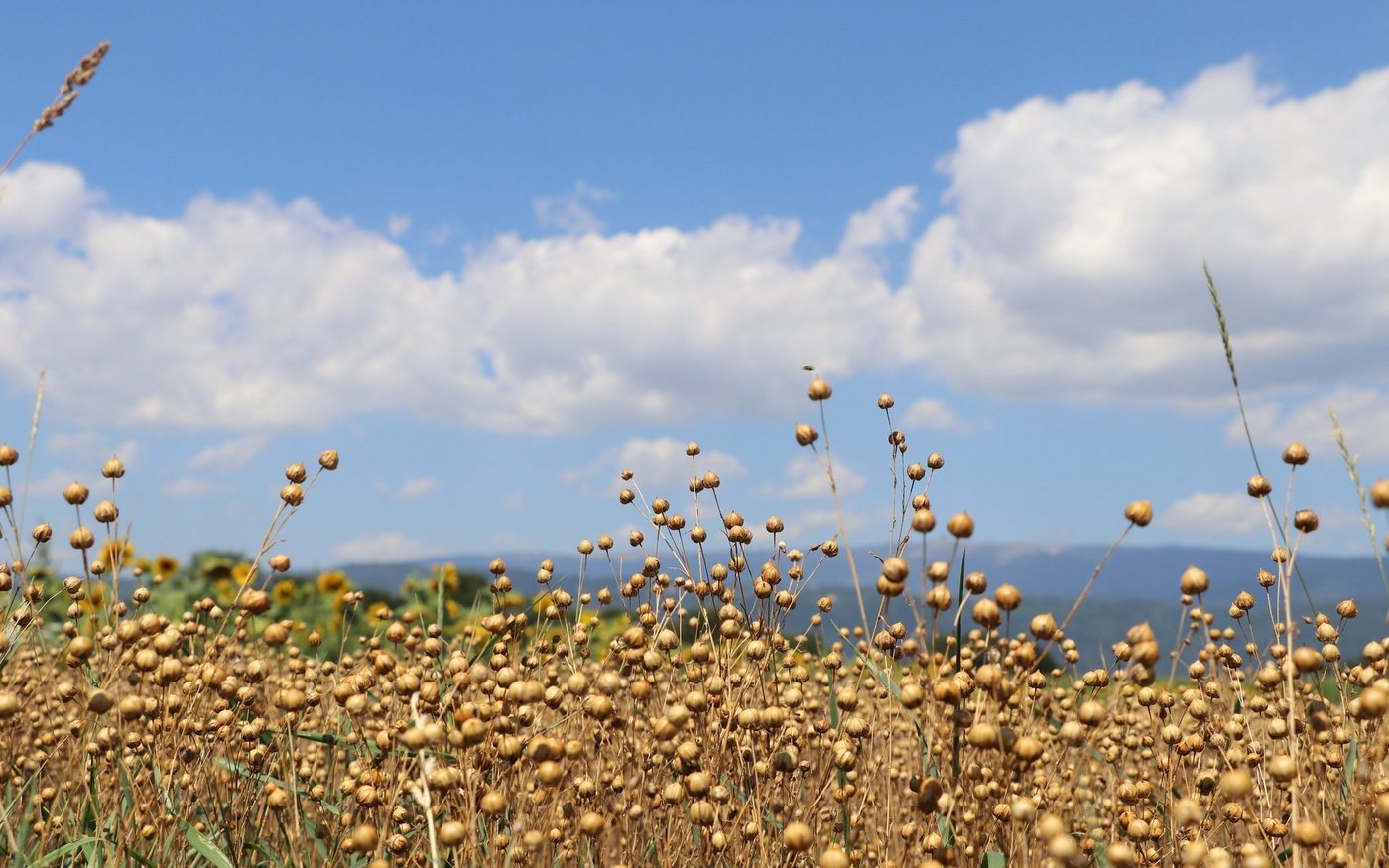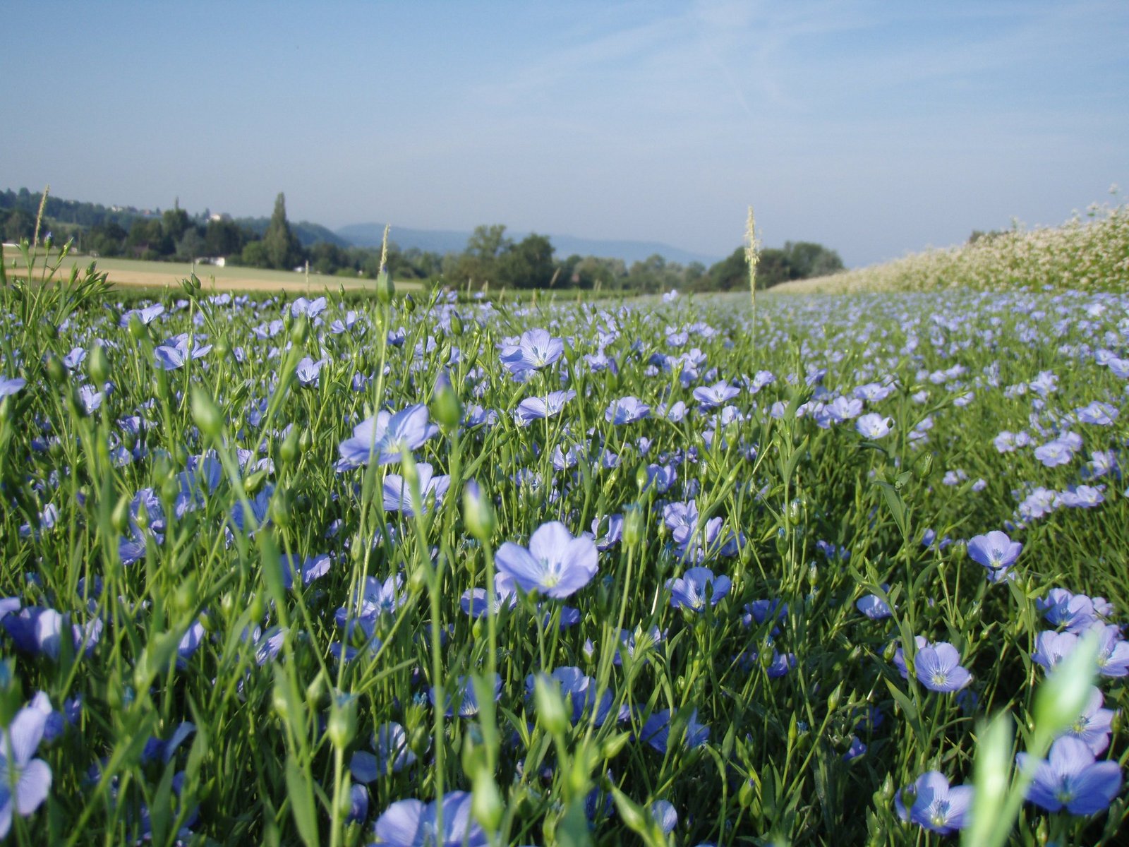 In der Blühphase dürfen die Produzenten und Passanten sich am blauen Feld erfreuen. Der Lein bildet nach dem Abblühen Kapseln, die im August respektive in frühen Jahren bereits im Juli erntereif sind.