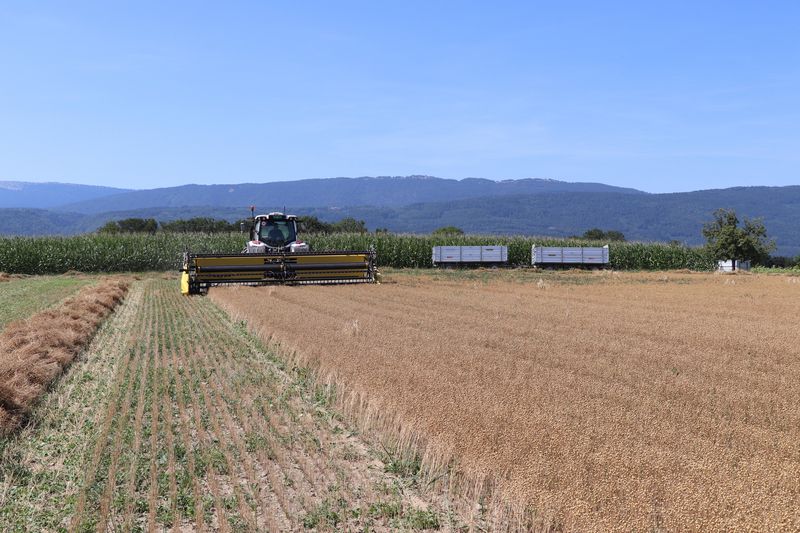 Schafer investierte 90‘000 CHF und sammelt nun gemeinsam mit Landwirten in verschiedenen Kulturen erste Erfahrungen. Das Gerät gleicht einem Schneidwerk, wie man es vom Mähdrescher kennt. Schafer fährt beim Leinschneiden mit einer Geschwindigkeit von zirka 6 km/h. Die Pflanzen werden geschnitten, auf dem Band zu einem Schwad zusammengeführt und auf dem Boden abgelegt. Wir durften exklusiv den ersten Einsatz im Lein begleiten.