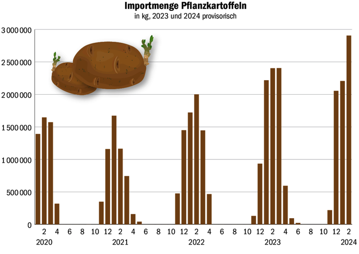 Die Schweiz hat in den ersten beiden Monaten dieses Jahres 5112 Tonnen Kartoffelpflanzgut importiert. Dies ist deutlich mehr als in den vergangenen Jahren. Dennoch werden nicht alle Produzenten die benötigte Menge bekommen. Für rund 10 Prozent der Anbaufläche dürfte der Schweiz heuer das Kartoffelpflanzgut fehlen. Schuld sind die sehr schlechte vergangene Ernte und die sinkende Anbaufläche. Schon in früheren Jahren…
