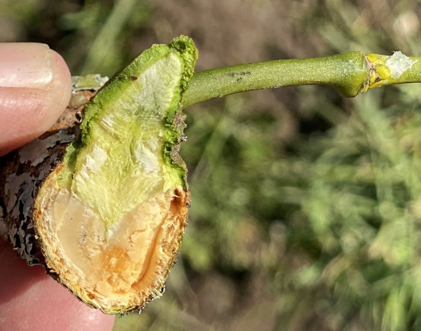Die grünen Senker (im Querschnitt grüne «Streifen») der Mistel breiten sich im Xylem und Phloem des Astes aus und können neue Pflänzchen bilden. (Bild ke)
