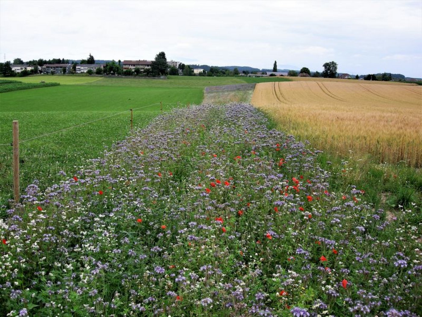 Biodiversitätsförderflächen auf der Ackerfläche kommen nicht nur der Natur zugute, sondern auch der Produktion von Lebens- und Futtermitteln: Durch diese Flächen werden Nützlinge und Bestäuber gefördert, welche zur Bekämpfung von Schädlingen in landwirtschaftlichen Kulturen und für die langfristige Sicherung der Bestäubung immens wichtig sind.