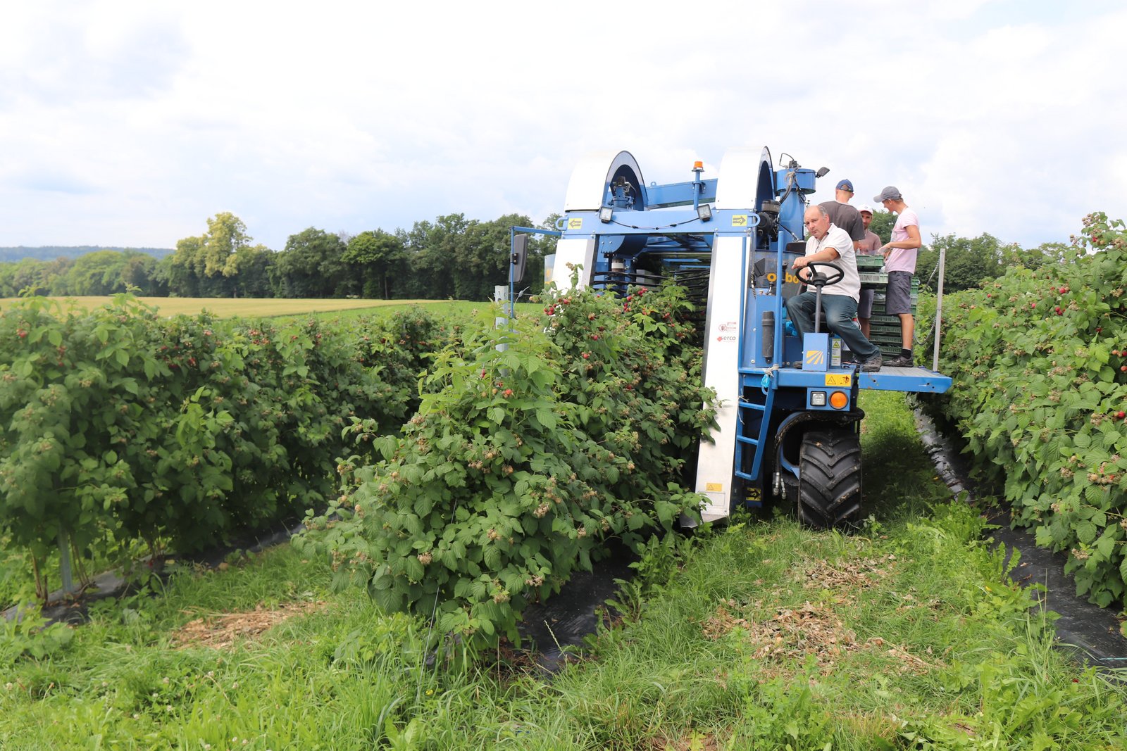 Jürg Beglinger, Landwirt im Zürcher Weinland, sitzt selber am Steuer des Vollernters. Dieser bewegt sich im Schneckentempo über einer Reihe von Himbeerstauden. Zwei vertikale, mit Kunststoffstäben versehene Walzen greifen dabei in die Beerenreihen hinein und sorgen mit Schüttelbewegungen dafür, dass sich die sehr reifen Beeren an den einzelnen Dolden vom Blütenboden trennen und in die Auffangschalen des Vollernters fallen. Spezielle Förderbänder transportieren sie auf den Verlesetisch. Dort werden die Beeren exakt aussortiert.