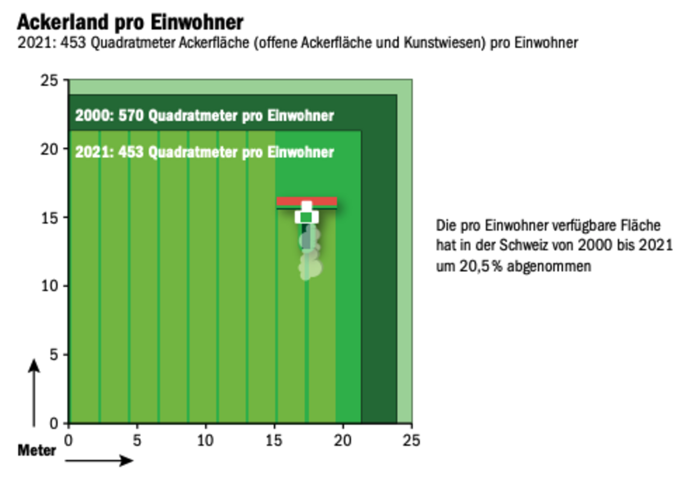 Die Schweizer Bevölkerung wächst kontinuierlich. Waren es zu Beginn des Jahres 2000 noch 7,2 Millionen Einwohner stieg diese Zahl bis Anfang Januar 2021 auf 8,8 Millionen. Die pro Einwohner verfügbare Landwirtschaftsfläche hat in der Folge laufend abgenommen. Standen im Jahr 2000 noch 570 Quadratmeter Ackerland pro Einwohner zur Verfügung, so waren es 21 Jahre später noch 453 Quadratmeter. Diese Fläche entspricht einem Quadrat von lediglich 21,3 auf 21,3 Meter und einer Abnahme um 20,5% im Vergleich zum Jahr 2000. Betrachtet man die gesamte landwirtschaftliche Nutzfläche, so ergibt sich im gleichen Zeitraum eine ähnliche relative Abnahme der Fläche pro Einwohner um 20,3%.