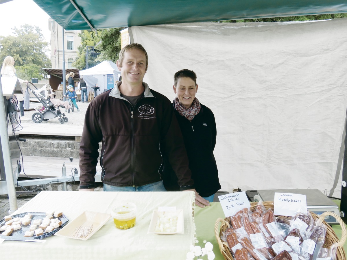 Mit Wurst- und Milchprodukten von ihren Schafen waren Sarah und Niklaus Elsener am Biomarkt vertreten. «Ich schätze den direkten Kontakt mit den Konsumenten», so Elsener. Besonders gute Reaktionen habe er auf den Streichkäse erhalten. Am normalen Wochenmarkt in Zug sei er der einzige Bioproduzent. «Hier ist es schön, hat es noch andere Bioproduzenten mit interessanten Produkten».