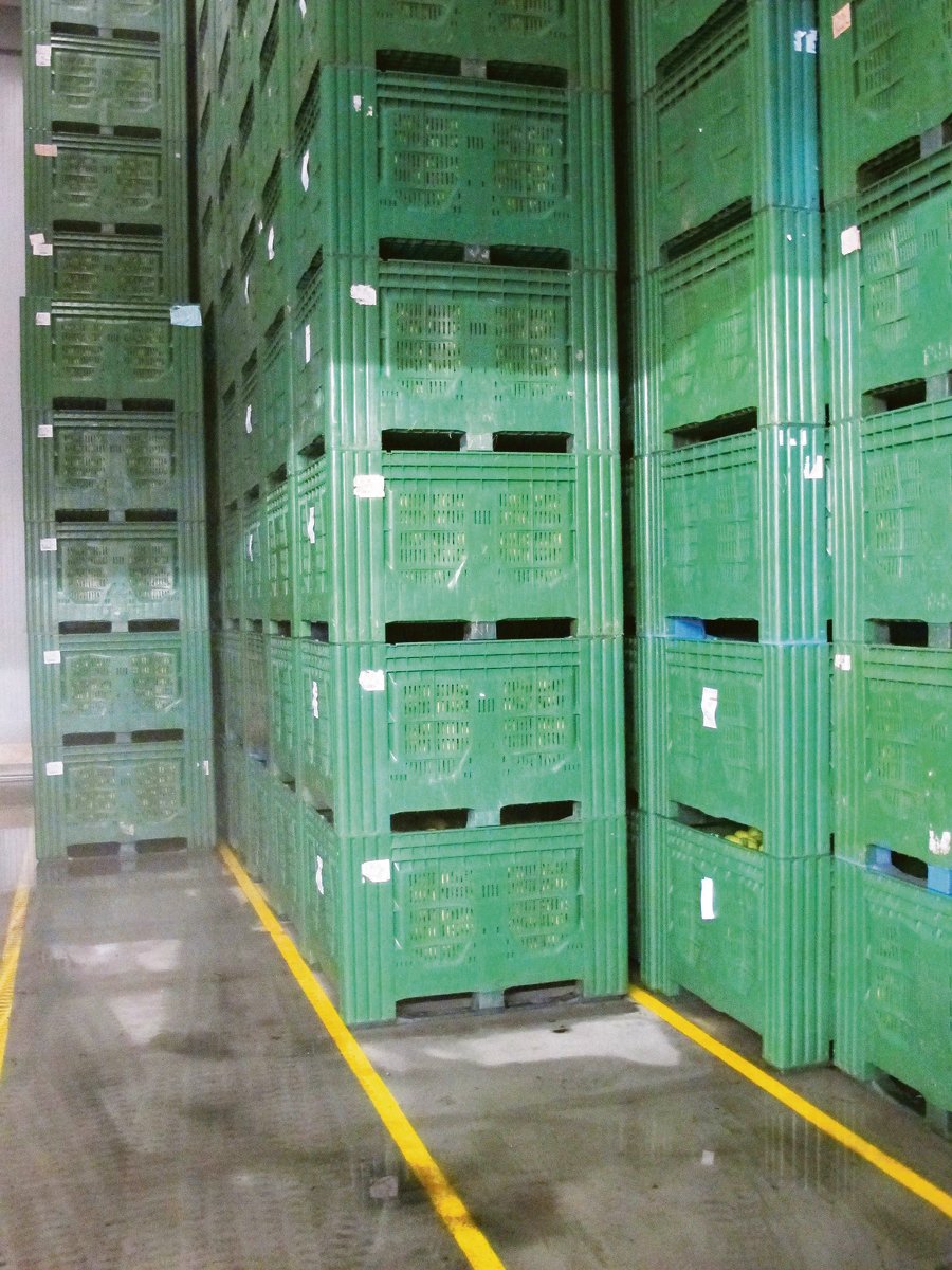Damit ein gleichmässiger Luftstrom im Kühllager entsteht und die Temperatur homogen verteilt ist, braucht es eine korrekte Stapelung der Obstkisten. Idealerweise werden am Boden Markierungen angebracht, damit die Stapel richtig in den Kühlraum gestellt werden. Es sollten Abstände von 10 cm zwischen den Stapeln in Längsrichtung sowie zwischen den Stapelreihen und den Seitenwänden eingehalten werden. Dies bewirkt vor allem in der Abkühlphase eine einheitlichere Abkühlung. Auf der Seite des Verdampfers und der gegenüberliegenden Seite sollte ein Abstand von 25 bis 45 cm eingehalten werden.