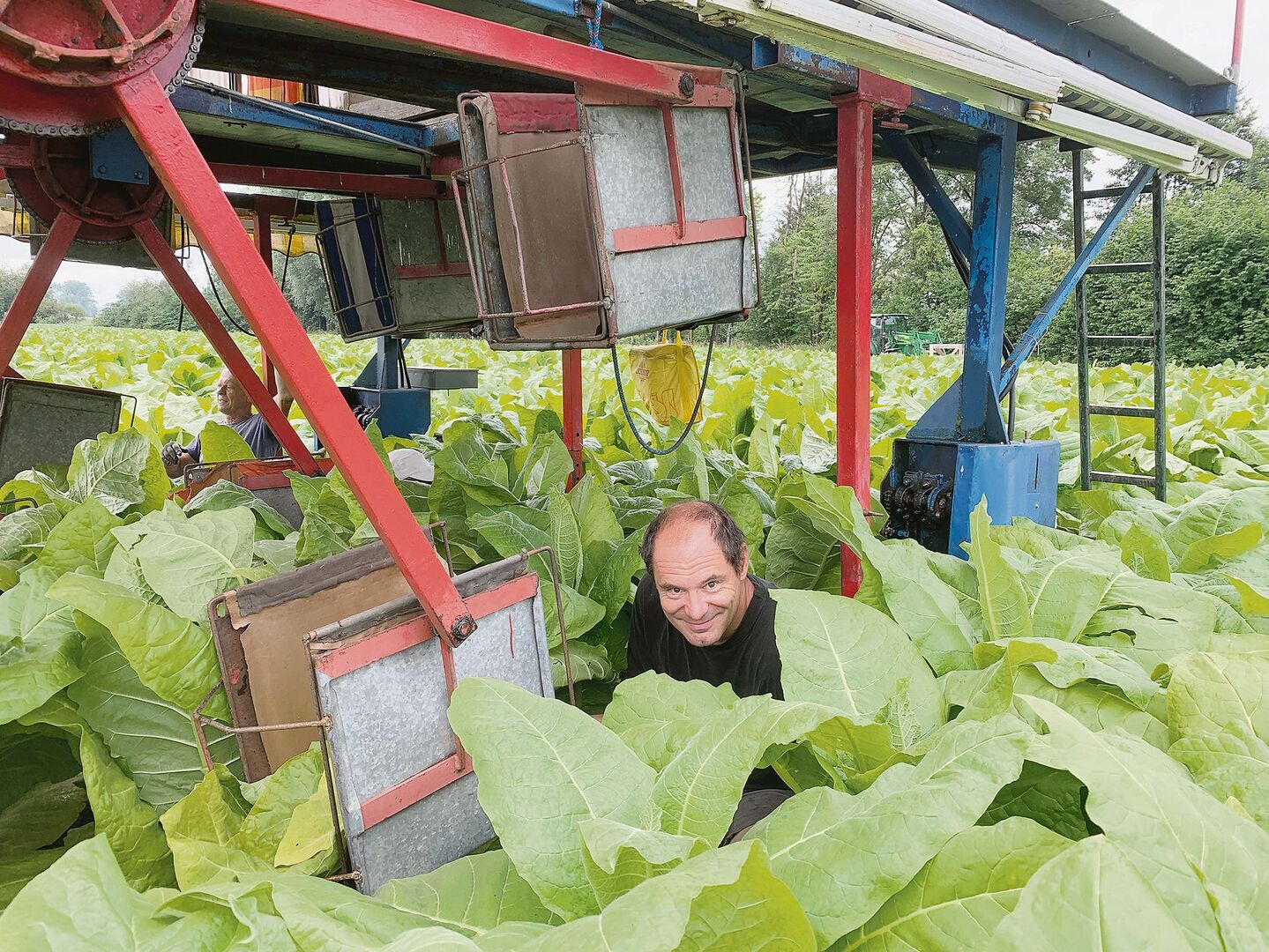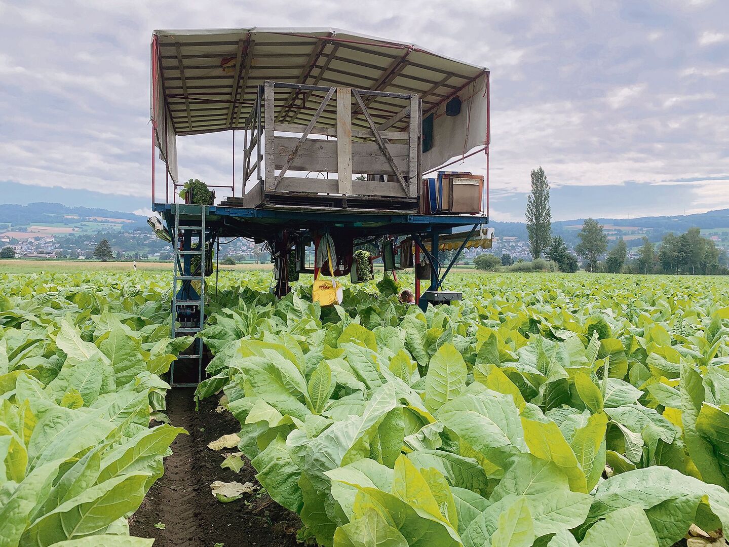 Seit dem 4. Juli ist das Gefährt zur Ernte von Tabakblättern bei Patrick und Denise Egli von der Feldmatt im luzernischen Geuensee wieder in Betrieb. Zu dritt sitzend werden auf der 1,5 ha grossen Parzelle drei bis fünf Blätter pro Pflanze von Hand gepflückt und in Boxen gelegt, die an einem grossen Rad befestigt sind. Ist eine voll, dreht sich das Gestell und die nächste Boxe wird befüllt. Derweil bewegt sich der Tabakernter langsam vorwärts. Die Erntezeit dauert bis Mitte September, die Reihen werden bis zu viermal abgepflückt, immer wieder wachsen neue Blätter nach.