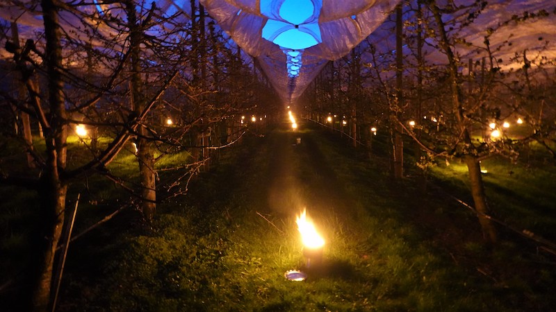 Anders sah es Anfang April (vom 31. März bis am 2. April) aus: In diesen kalten Nächten gab es Strahlungsfrost. Der Wind wehte also nicht heftig und Überkronenbewässerung, Frostkerzen und Heizen mit Öfen konnten ihre Schutzwirkung entfalten.