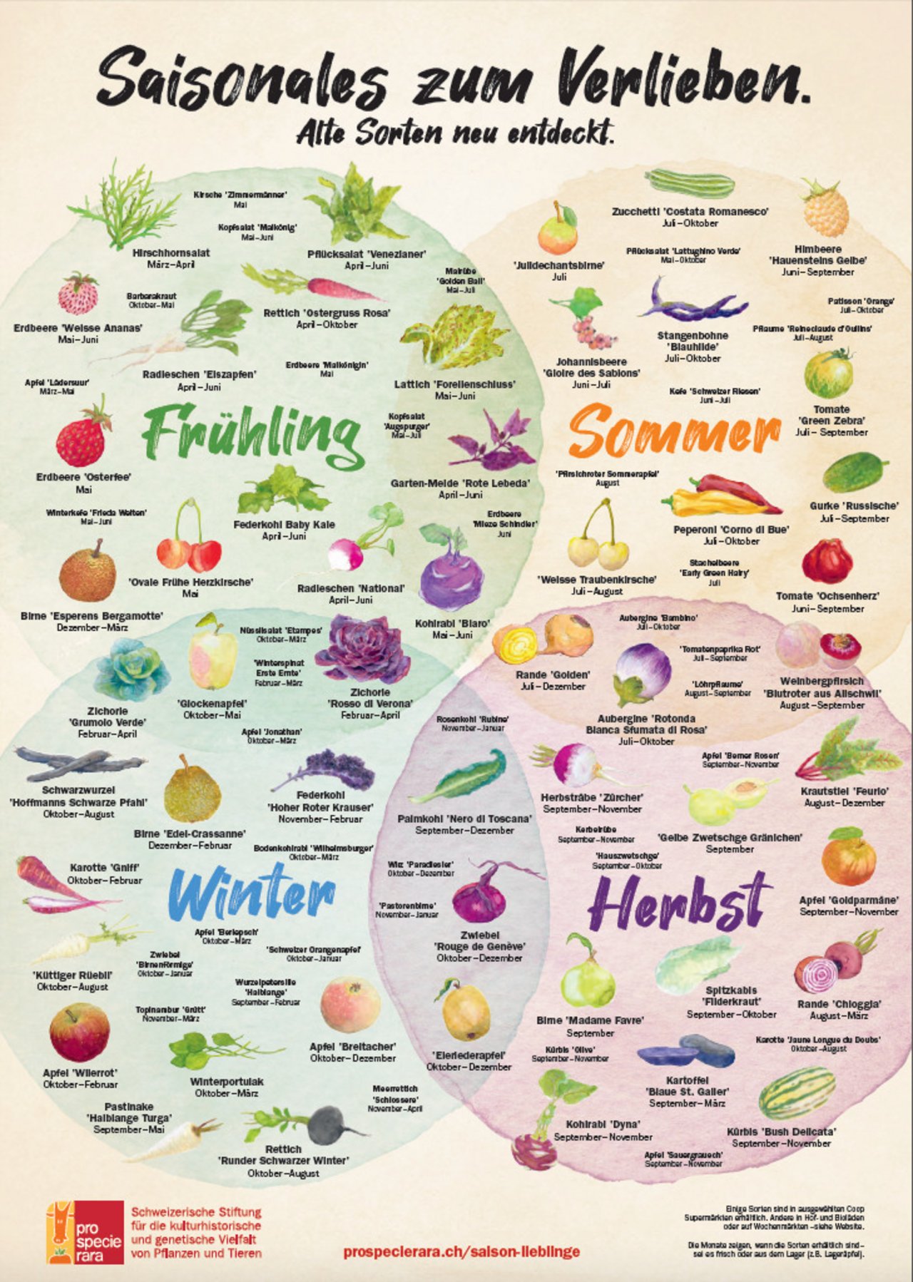Das illustrierte Saisonposter mit einer Übersicht über 50 verschiedene Sorten kann kostenlos unter www.prospecierara.ch/saison-lieblinge bestellt werden. (Poster Pro Specie Rara)