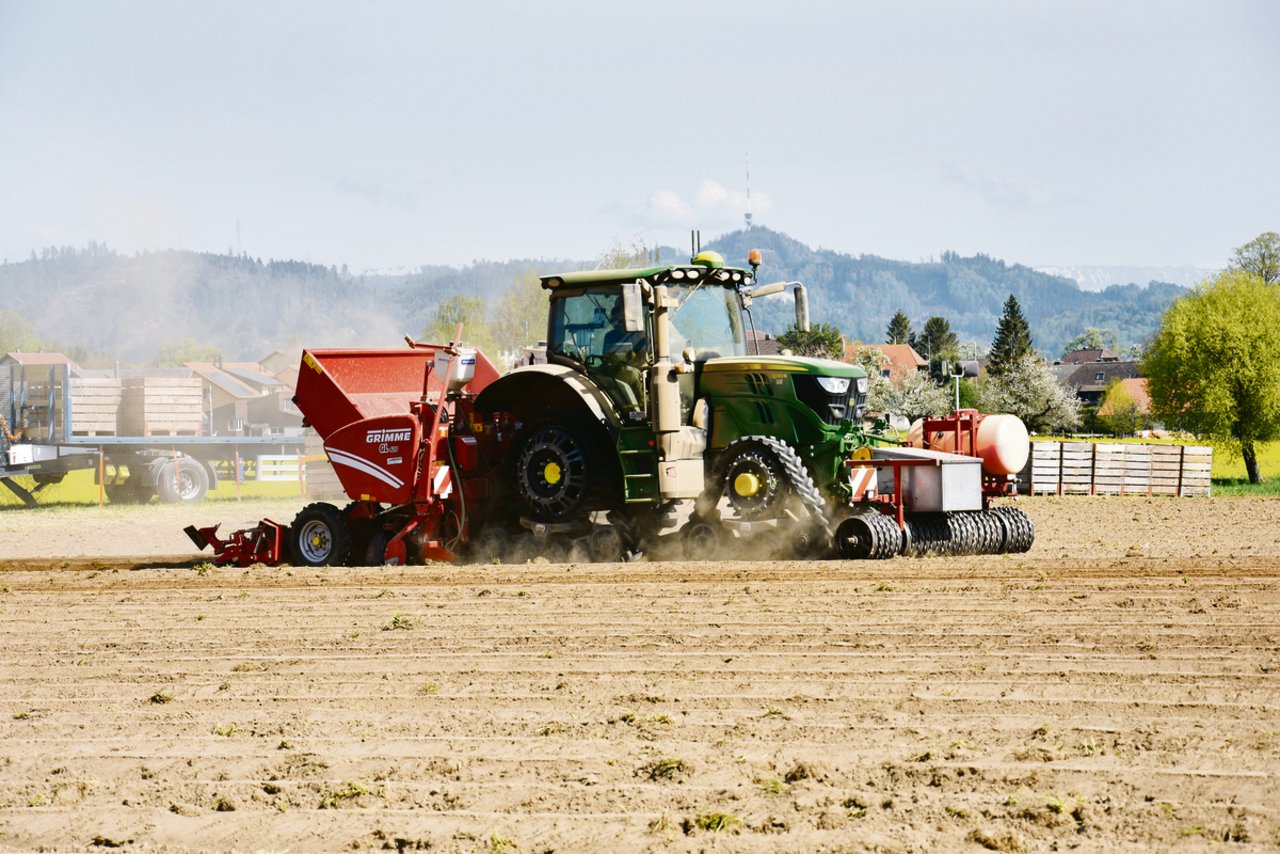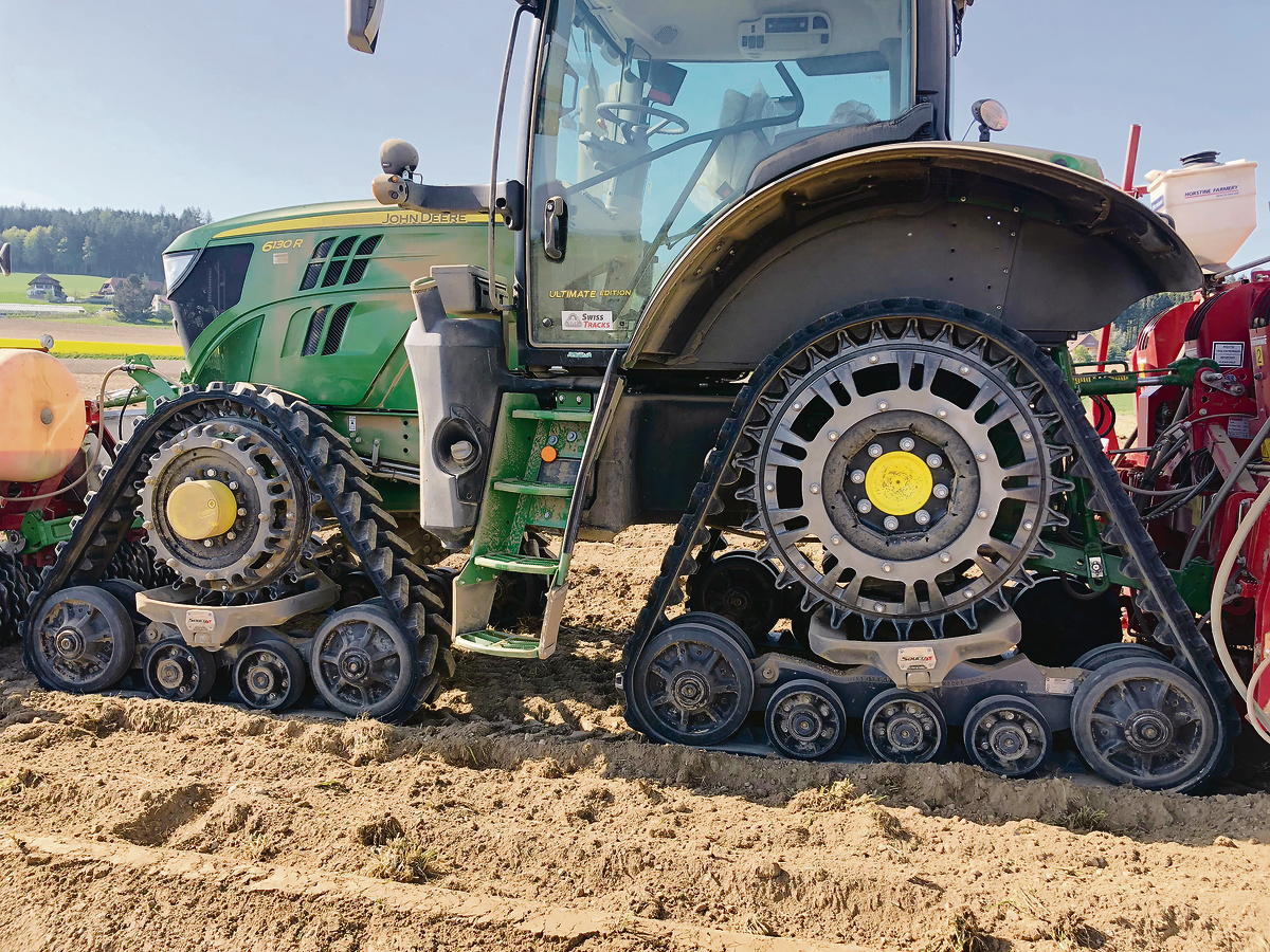 Es ist heiss und staubig, als Landwirt Marti aus Grossaffoltern BE in Kirchlindach seine Kartoffeln setzt. Schon von Weitem fällt auf, dass der Traktor vor dem Grimme-Setzautomat ziemlich hoch ist. Es ist ein John Deere 6130 R, der nicht auf Rädern fährt, sondern auf Raupen. In Kanada hergestellt «Das sind Soucy-Tracks aus Kanada», erklärt Stefan Wyss vom Lohnunternehmen Wyss-Ittigen. Gemeinsam mit den Firmen…