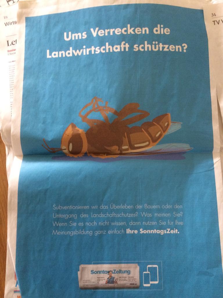 "Ums verrecken die Landwirtschaft schützen?", fragt ein Inserat, das dieser Tage verschiedenenorts für die "Sonntags-Zeitung" wirbt. Im Kleingedruckten heisst es dann: "Subventionieren wir das Überleben der Bauern oder den Untergang des Landschaftsschutzes?"