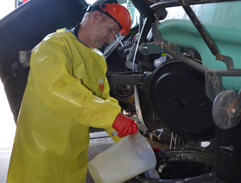 • Im Traktor sollten Handschuhe, Ersatzdüsen, Papierhandtücher und ein Abfallbehälter vorhanden sein, ausserdem ein gefüllter Frischwasserbehälter auf der Spritze zum Abspülen von Handschuhen und Händen.