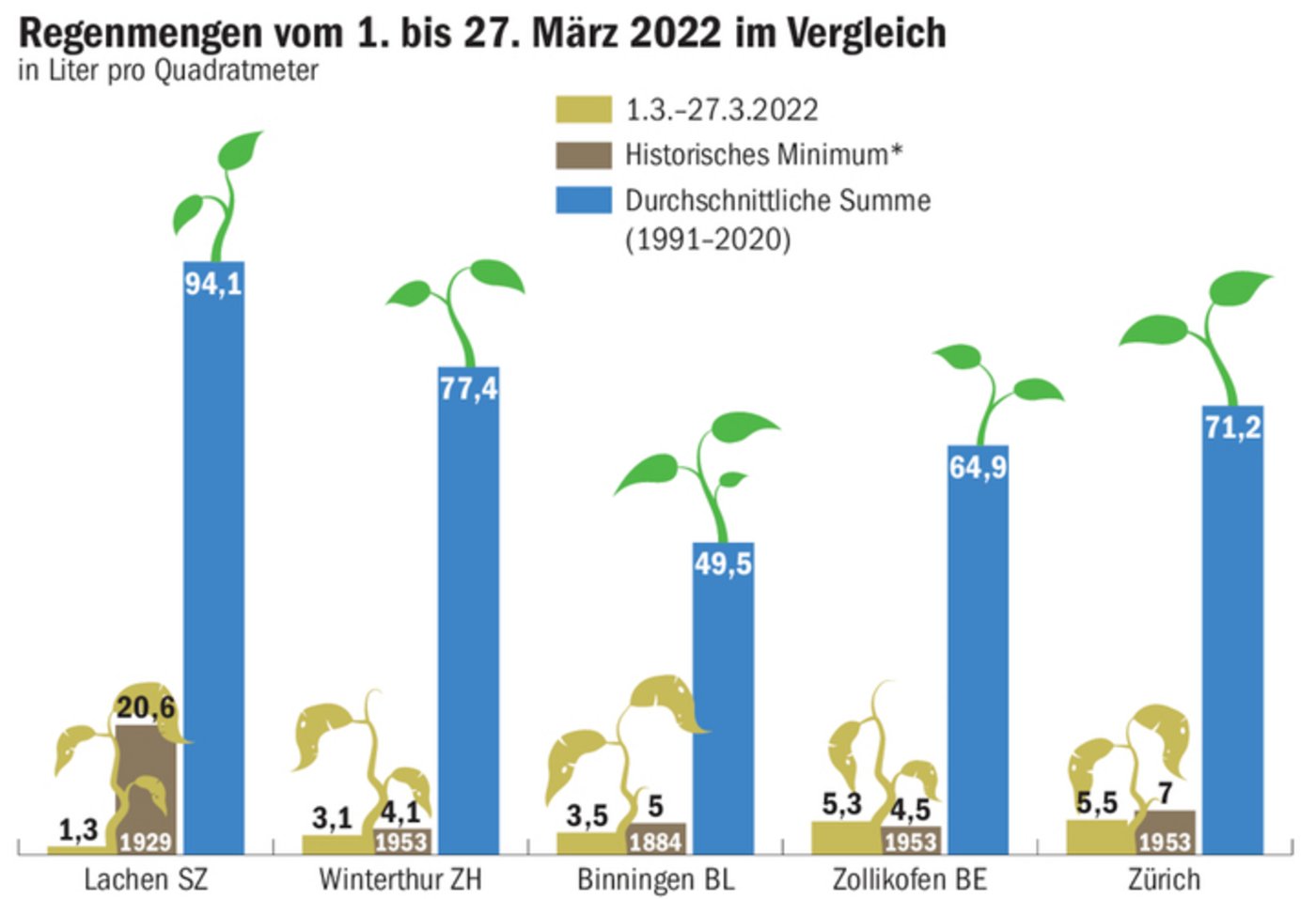 Zürich registrierte mit 250 Sonnenstunden den sonnigsten März seit Messbeginn 1884. In Zürich, Basel und Bern gab es gemäss der Langzeitmessung in den Märzmonaten 1953, 1848 und 1938 ähnlich lang Sonne. Bern erlebte auch 1893 einen annähernd so sonnigem März wie aktuell.