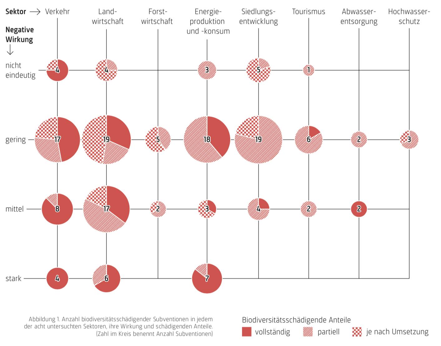 Die Studie befasste sich mit Subventionen in acht Sektoren und teilte sie je nach Schweregrad der negativen Wirkungen auf die Artenvielfalt und den biodiversitätsschädigenden Anteilen auf. Das Faktenblatt dazu gibt Beispiele und Empfehlungen für alle untersuchten Bereiche.