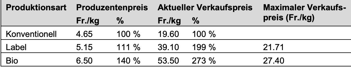 Laut dem Schweizer Tierschutz STS bremsen hohe Margen auf Label- und Bioprodukten im Detailhandel den Absatz in diesem Sortiment. Um dem entgegen zu wirken, schlägt der Tierschutz-Dachverband den Branchenansatz «maximale Preisrelationen» vor. Damit sollten sich die Detailhändler freiwillig verpflichten, maximale Bandbreiten einzuhalten, was die grosse Preisschere zwischen Label- und Bio- zu konventionellen Produkten hätte schliessen können (siehe Kasten). Die Wettbewerbskommission (Weko) bestätigt, dass eine solche Vereinbarung eine Verschiebung der Nachfrage herbeiführen könnte. Sie sei aber nicht zulässig, heisst es im Dokument zu den Beratungen der Weko.