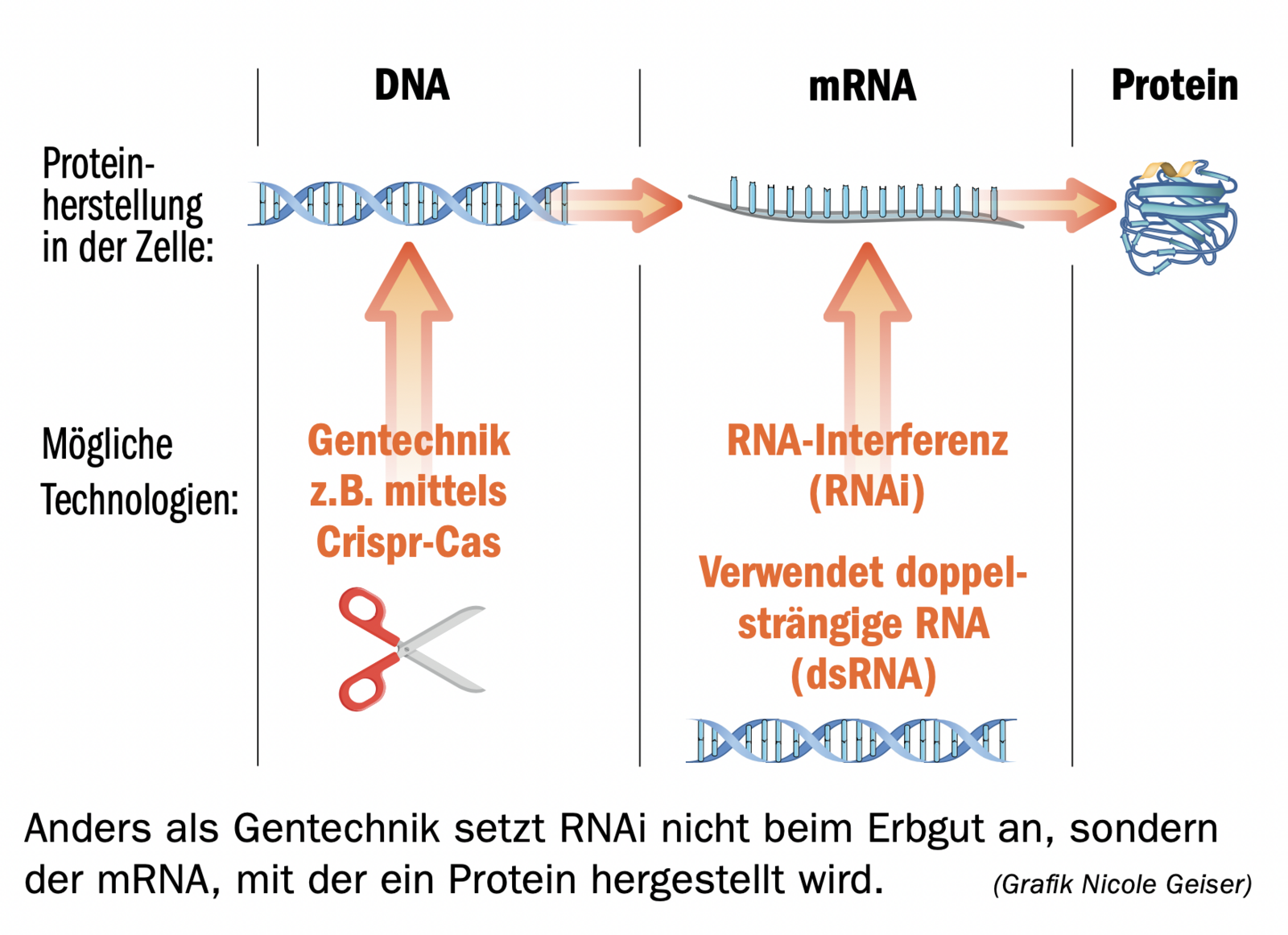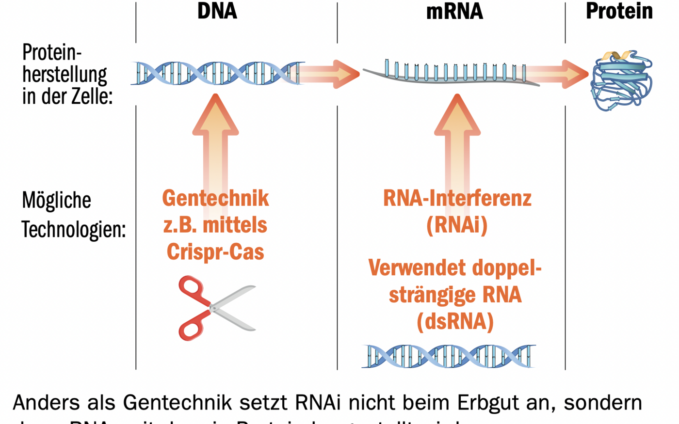 An sich nutzt man beim Auslösen von RNAi einen natürlichen biologischen Mechanismus (siehe Kasten) und RNA-Moleküle kommen in verschiedener Form in unserer Umwelt praktisch überall vor. Über die Nahrung aufgenommen werden sie nach Einschätzung der OECD im menschlichen Verdauungstrakt zuverlässig abgebaut und stellen keine Gefahr dar. Dass somit kein in dem Sinne chemischer Wirkstoff zum Einsatz kommen würde, macht doppelsträngige (ds)RNA für den Pflanzenschutz interessant – Umso mehr, wenn der Schritt aus der Gentechnik-Ecke gelingt.