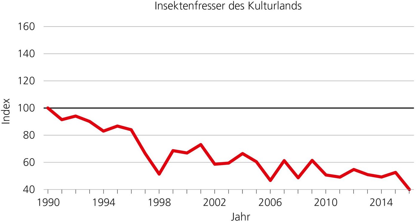 Der Index zeigt den Trend zu rückläufigen Beständen in der Gruppe der insektenfressenden Vögel. (Grafik Brutvogelatlas 2013–2016)