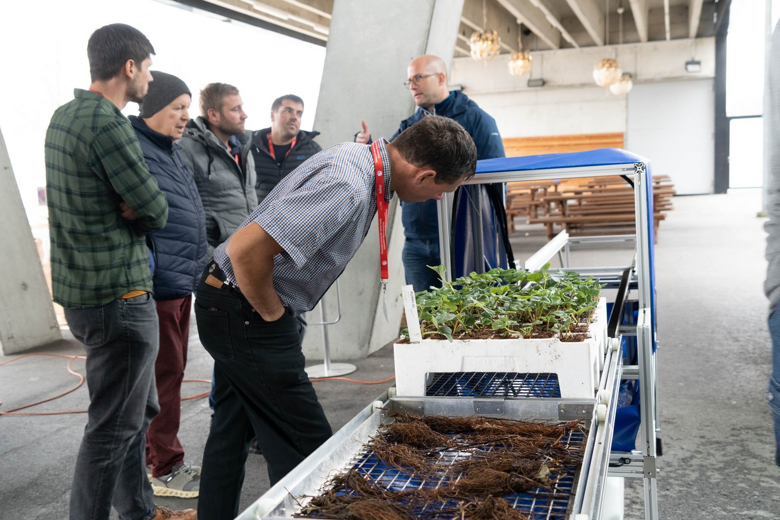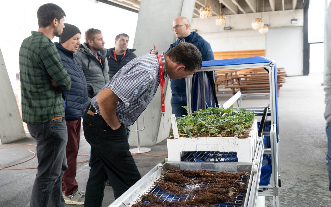 Zur nicht-chemischen Behandlung von Erdbeer-Jungpflanzen gegen Botrytis präsentierte die ZHAW unter der Leitung von Marilena Palmisano eine dafür konzipierte Anlage und stellte die ersten Erfahrungen vor. Dabei werden die Jungpflanzen bestrahlt mit UV-C Strahlen.