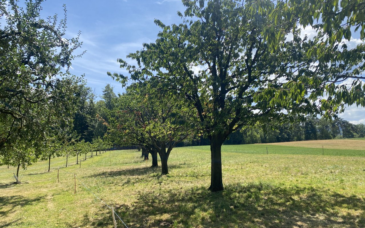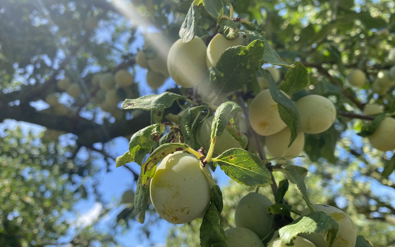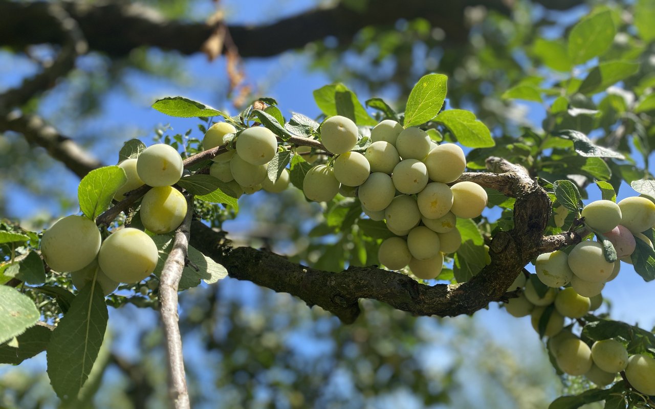 Im Frühling und im Herbst dient die Streuobstwiese mit den Mirabellen-Bäumen als Weide für die Milchkühe der Schwobs. Die Pflanzen seien daran gewöhnt: «Die Wurzeln sind tief und der Tritt des Viehs verursacht keinen Schaden», so die Einschätzung des Betriebsleiters. Für einen Profi-Betrieb wäre das ein No-Go, meint seine Gattin. Schliesslich werden die unteren Zweige abgefressen. «Aber bei uns geht das Milchvieh vor», stellt Myriam Schwob klar. Zum Schutz vor Rehen aus dem nahen Wald tragen die Stämme allerdings ein Zaungitter im unteren Bereich. Die Wildtiere dringen zum Teil bis zu den Rosen im Hausgarten vor.