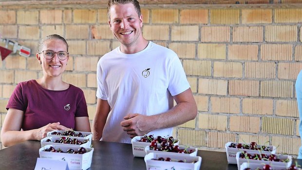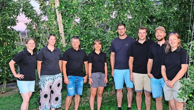 «Hier haben wir im letzten November 107 Hochstammbäume, 147 Spindeln und 114 Beerensträucher gepflanzt», schildert Valentin Birbaum. Er steht auf einer drei Hektaren grossen Fläche, die rundherum von einer Q1-Hecke, Biodiversitätsförderfläche, alten Nussbäumen und dem Waldrand begrenzt wird. Auf der ehemaligen Rinderweide wachsen Zwetschgen, Äpfel, Birnen, Kirschen, Kaki, Kastanien, Mirabellen, Pfirsiche, Johannisbeeren, Cassis, Blaubeeren, Sanddorn und mehr. «Es ging auch um die Erhaltung alter Sorten, da arbeiten wir mit Pro Specie Rara zusammen», erläutert Armin Komposch, Vorstandsmitglied von TaPatate. Die Nord-Süd-ausgerichteten Reihen sind so gepflanzt, dass Früchte mit ähnlichen Erntezeitpunkten benachbart wachsen. «So können wir uns durchs Jahr von hinten nach vorne durchernten», erklärt Birbaum die Überlegung.