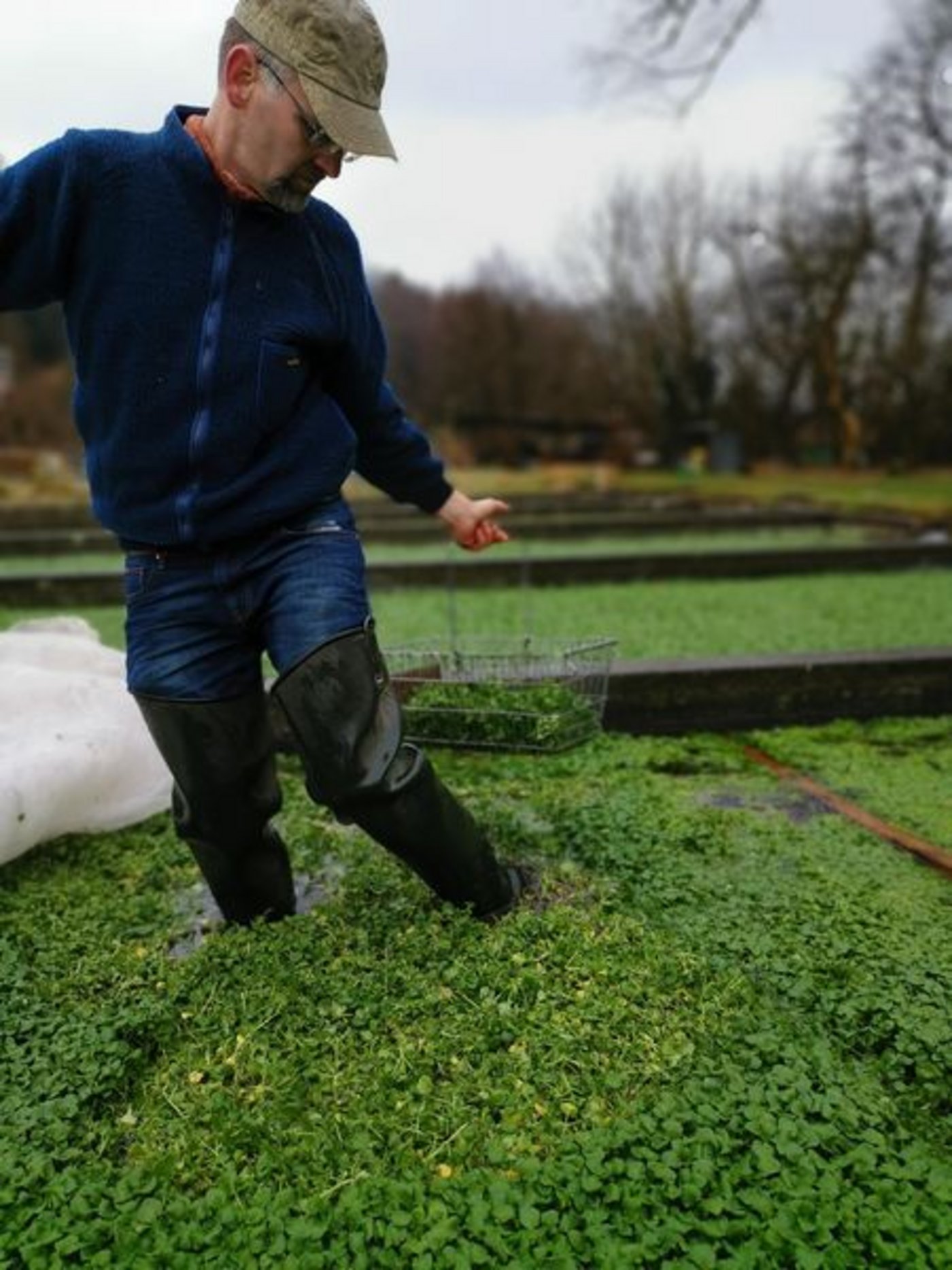 Nicht nur die Ernte, auch das Kultivieren von Brunnenkresse ist arbeitsaufwändig, teils täglich müssen die Wasserpegel angepasst werden. Da im obliegenden Naturschutzgebiet ganze Biberfamilien leben, muss jeden Morgen kontrolliert werden, ob der Biber nicht die Wasserzufuhr gestört hat oder Enten die Pflanzen beschädigen. «Da direkt im Quell- und Bachwasser kultiviert wird, ist der Einsatz von Dünger und Bioziden in unserem Bio-Betrieb komplett tabu», sagt Werner Stirnimann, ein gelernter Gärtner, der neben seinem Agronomie-Diplom auch einen Abschluss in Umweltingenieurwesen gemacht hat.