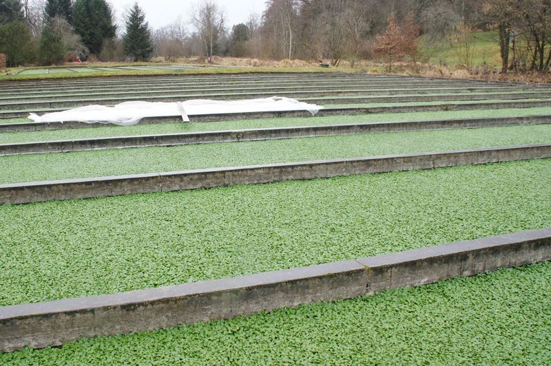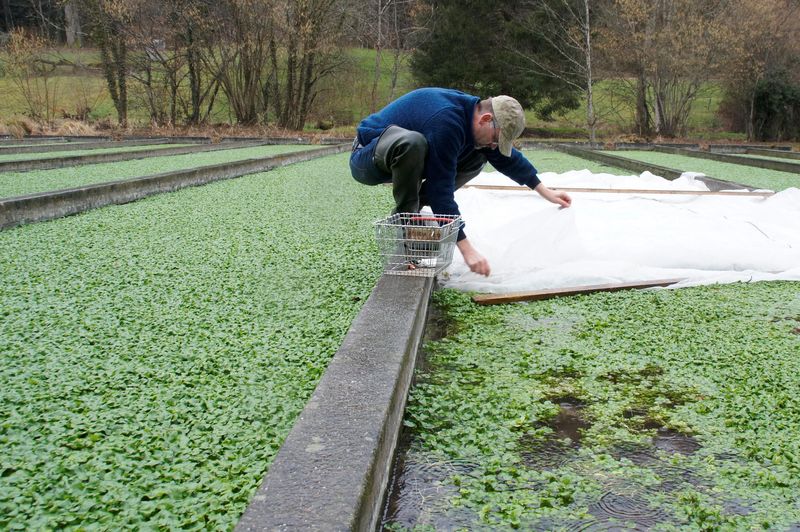Die Pflanzen können fünf- bis sechsmal im Jahr geschnitten werden. Erst nach einigen Jahren müssen die beckenartigen Bäche geleert und Sedimentschichten entfernt werden. Zur Vermehrung schneidet das Team hochgewachsene Brunnenkresse in Teile, streut sie auf das wenige verbleibende und geglättete Sediment und leitet nach und nach wieder mehr Wasser ein. Sobald der neu heranwachsende Pflanzenbestand etwa 20 Zentimeter hoch ist, kann erneut Salat geerntet werden.