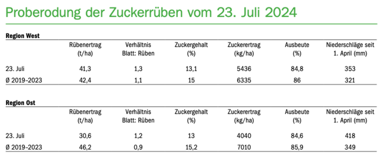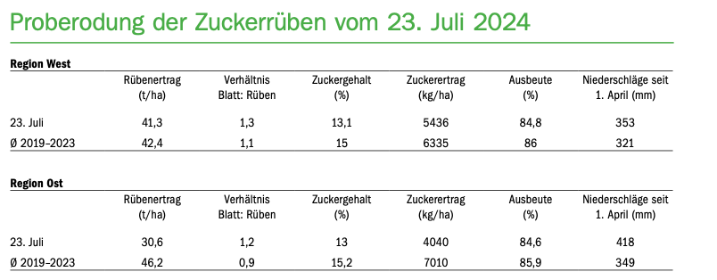 Wie jedes Jahr fanden vergangene Woche die ersten Proberodungen in den Zuckerrüben statt. Die Ergebnisse zeigen, dass es durchaus erhebliche Unterschiede bei den Resultaten zwischen den Anbauregionen im Osten und im Westen gibt. Allen voran fällt der eher dürftige Rübenertrag im Osten ins Auge. Mit 30,6 t/ha liegt er nicht nur tiefer als im Westen, sondern auch deutlich tiefer als der Fünfjahresschnitt mit 46,2…