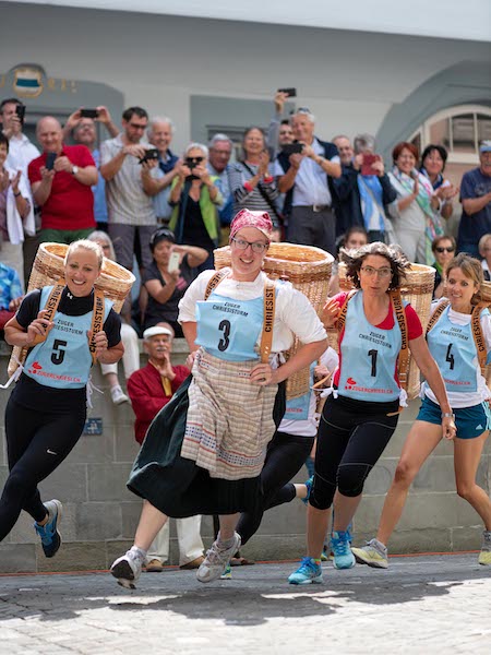 Auch die Damen steigen ins Rennen. Sie rennen heuer zum zweiten Mal mit Kirschkörben (Chrieishutten) durch die Stadt.
